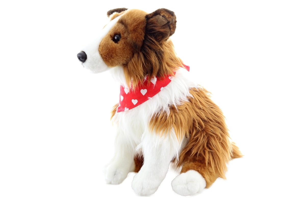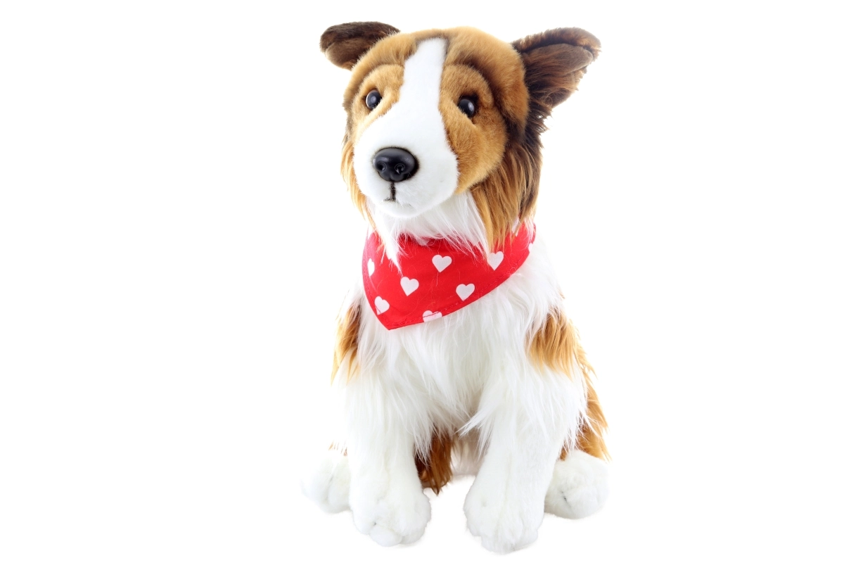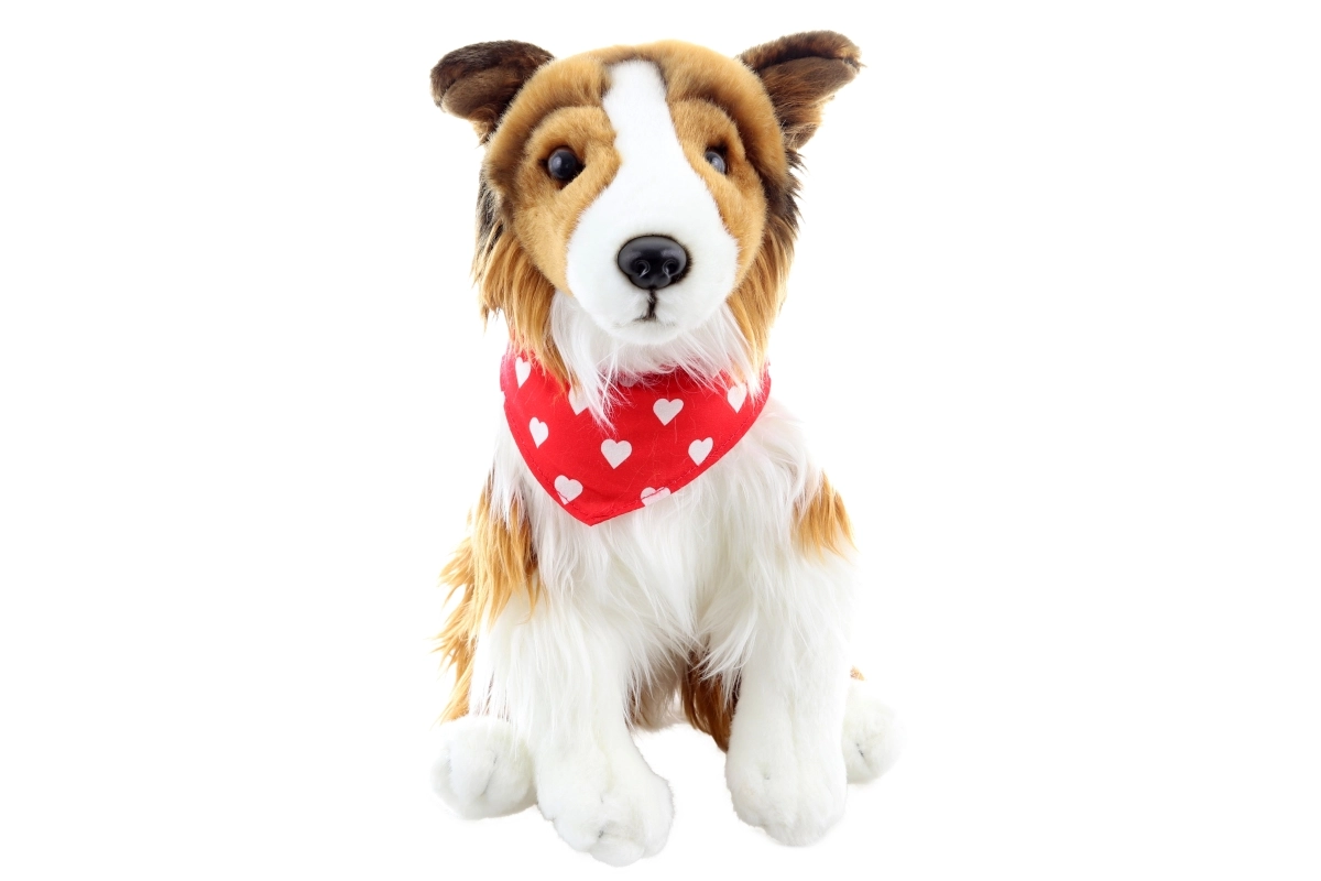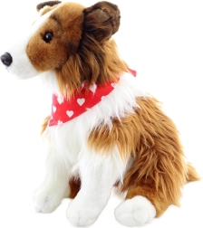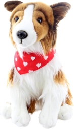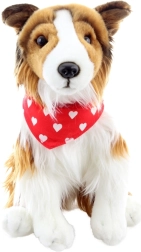 Αυτό το λούτρινο παιχνίδι σε σχήμα σκύλου μακρύτριχης κόλι είναι καλυμμένο με απαλό καφέ-λευκό γουνάκι και είναι ιδανικό για παιδιά από 0 ετών. Διαθέτει κόκκινο μαντίλι με λευκά καρδουλάκια, που προσθέτει στη γοητεία του.