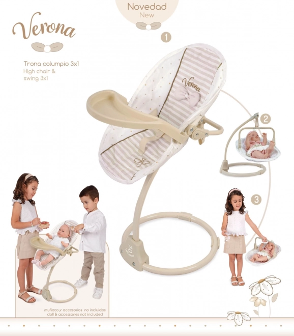 Κομψό και πρακτικό σετ 3 σε 1 για κούκλες από τη συλλογή Verona που συνδυάζει καρεκλάκι φαγητού, κούνια και καθισματάκι μεταφοράς σε ένα. Χάρη στο αφαιρούμενο, διπλής όψης καθισματάκι με ζώνες ασφαλείας και το πλαστικό τραπεζάκι, το παιχνίδι είναι εύκολο και ασφαλές. Ο μοντέρνος σχεδιασμός σε απαλές φυσικές αποχρώσεις, η ποιοτική κατασκευή και η εύκολη χρήση θα χαροποιήσουν κάθε παιδί από 3 ετών και άνω.