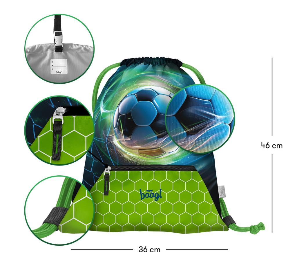 Στυλάτο και λειτουργικό σακουλάκι Baagl σε σχέδιο ποδοσφαιρικής μπάλας, ιδανικό για το σχολείο, την προπόνηση και τον ελεύθερο χρόνο. Το ανθεκτικό, πλενόμενο υλικό εξασφαλίζει μακρά διάρκεια ζωής και εύκολη συντήρηση, ενώ τα κορδόνια επιτρέπουν άνετη μεταφορά στην πλάτη.