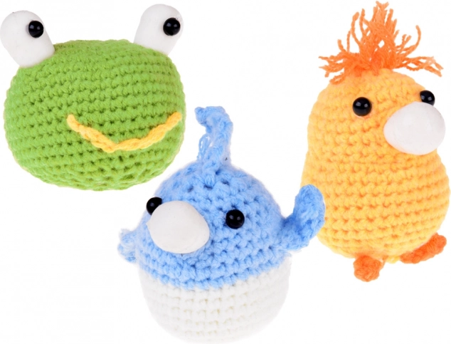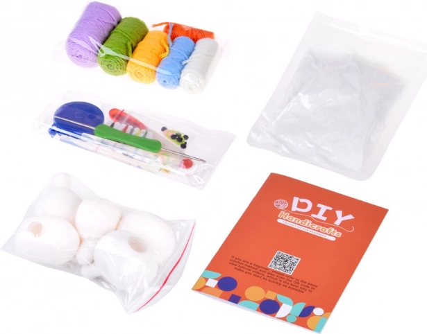 - 6× κουβαράκι νήματος (εκρού, μπλε, κίτρινο, πράσινο, μωβ, πορτοκαλί); 5× λαστιχένιο μπαλόνι για γέμισμα· γέμισμα (βάτα)· βελονάκι 2,5 mm· ασφαλές ψαλίδι· 2× ασφαλής βελόνα· αυτοκόλλητα ματάκια· 10× παραμάνα/δείκτης· μεζούρα τυλιχτή· ράβδος θερμοκόλλας· εικονογραφημένες οδηγίες (EN)