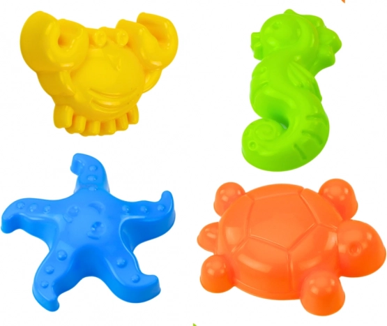 Τα καλουπάκια θαλάσσιων πλασμάτων, όπως ιππόκαμπος, αστερίας, καβούρι και χελώνα, προσδίδουν ένα διασκεδαστικό στοιχείο στο παιχνίδι και επιτρέπουν τη δημιουργία εντυπωσιακών γλυπτών από άμμο. Το σετ διαθέτει ζωηρά χρώματα που τραβούν την προσοχή των παιδιών.