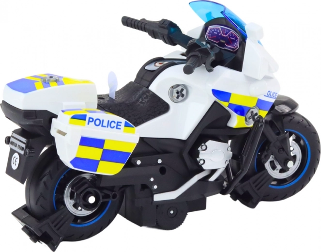 Αυτή η λευκή αστυνομική μοτοσικλέτα με μπλε-κίτρινα καρό στοιχεία εντυπωσιάζει με αυθεντική εμφάνιση και λειτουργίες που βυθίζουν τα παιδιά σε παιχνίδι δράσης. Φλας και σειρήνες δίνουν στο αστυνομικό παιχνίδι πραγματικό παλμό, ενώ ο μηχανισμός αδράνειας εξασφαλίζει ομαλή εκκίνηση με ένα απλό σπρώξιμο.