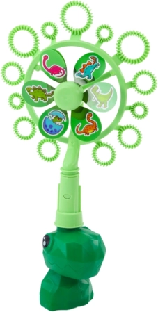 Εύκολο γέμισμα του διαλύματος στο μπολ και άνετο βούτηγμα του ανεμομύλου. Το πράσινο δοχείο σε σχήμα δεινόσαυρου εντυπωσιάζει τα παιδιά με την πρώτη ματιά.