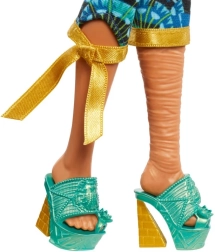 Η κούκλα Cleo De Nile ετοιμάζεται για το πιο καυτό μουσικό event της χρονιάς – το Monster Fest! Ξεχωρίζει με τοπ με χρυσά μανίκια, παντελόνι σε χρώματα πολύτιμων λίθων και κορώνα με μοτίβο λωτού που αναδεικνύει τα μακριά μπλε μαλλιά της. Χάρη στους αρθρώσεις της, ρυθμίζεις εύκολα cool πόζες για φωτογραφίες και αφήγηση ιστοριών.