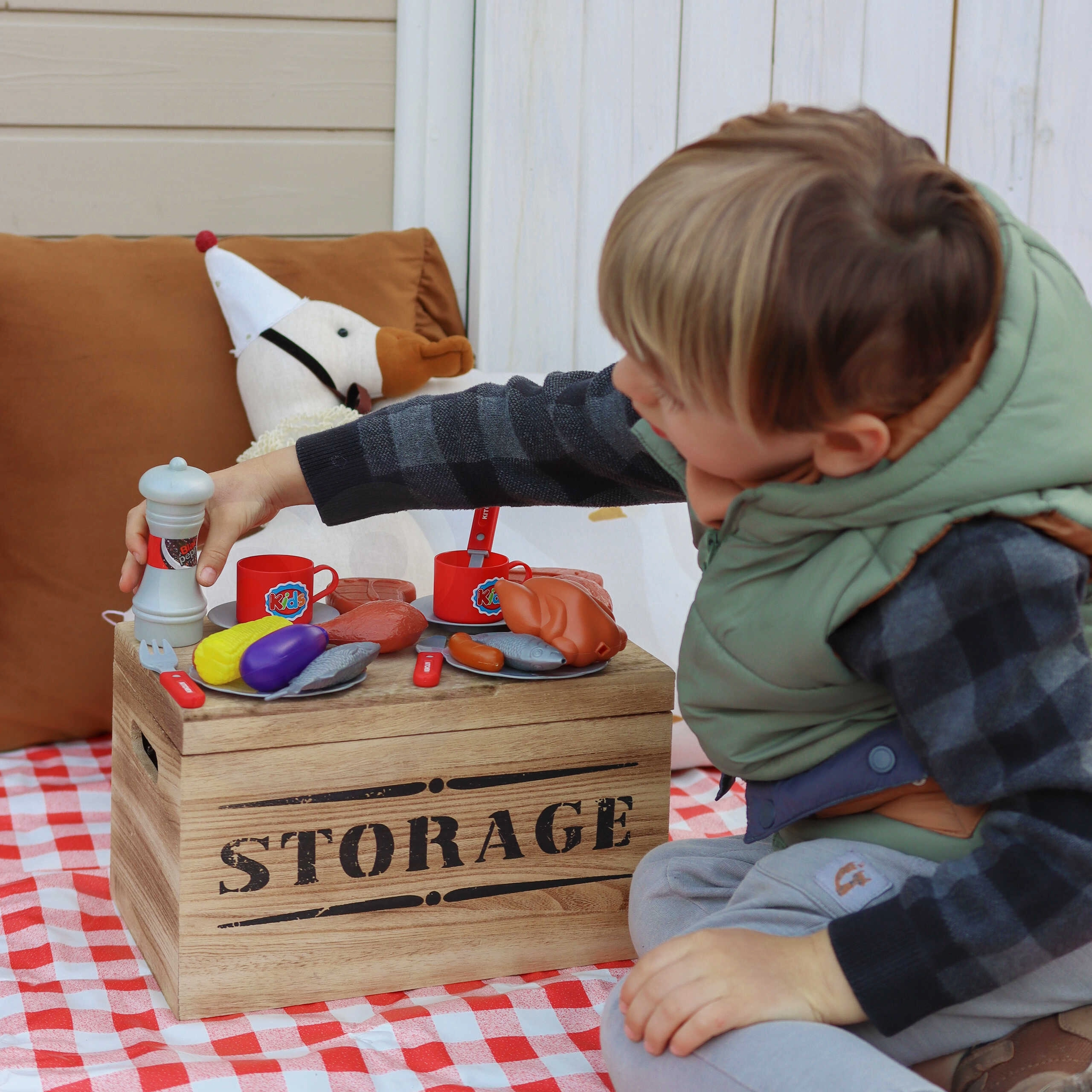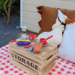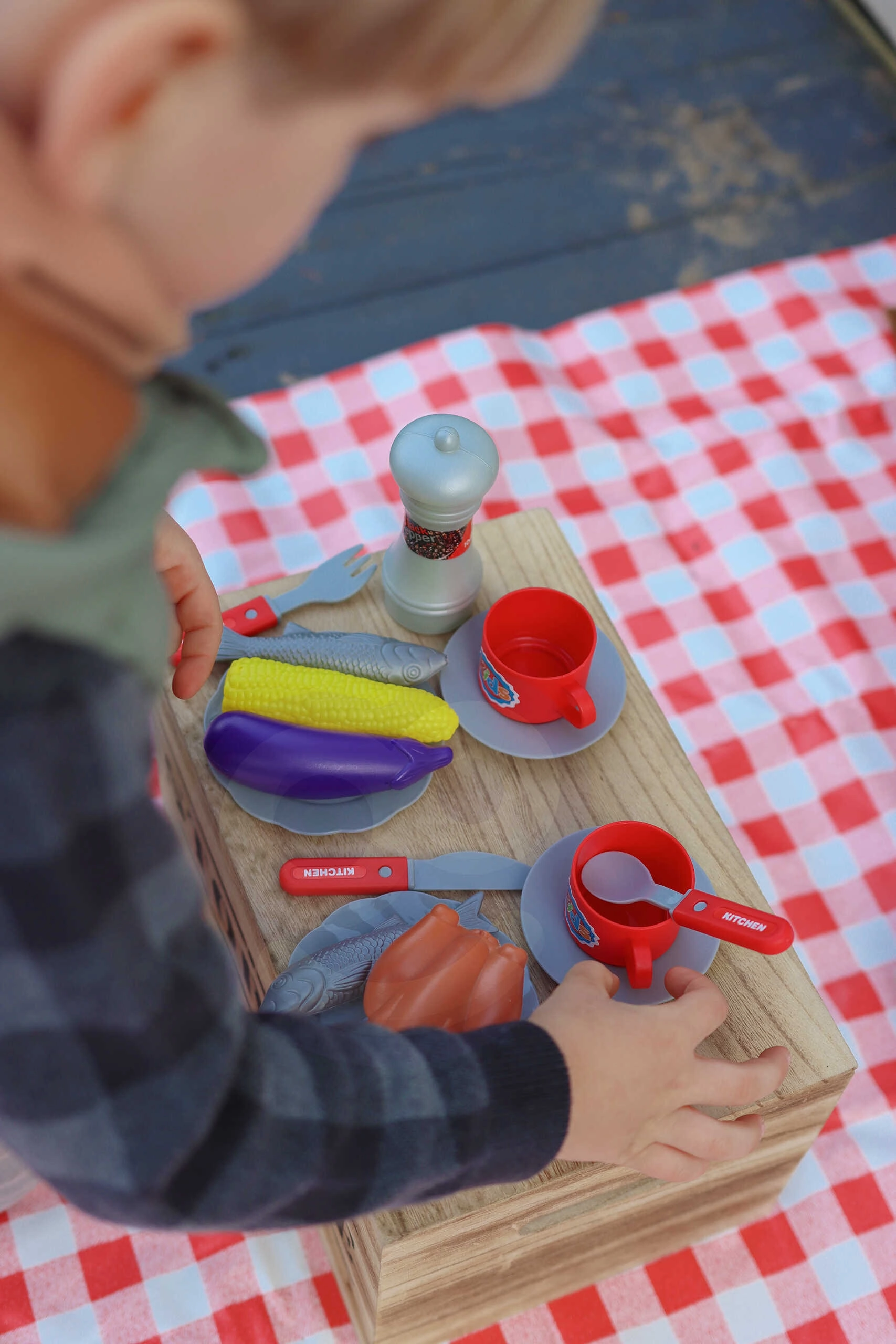 Λουκάνικα, μπριζόλες, κοτόπουλο, ψάρια, καλαμπόκι, μελιτζάνα, πιάτα, μαχαιροπήρουνα, ποτηράκια, μύλος πιπεριού, λαβίδα και αναπτήρας – όλα σε ένα πακέτο για ατελείωτες ώρες παιχνιδιού.