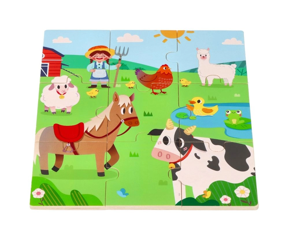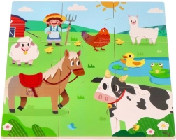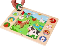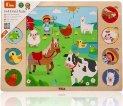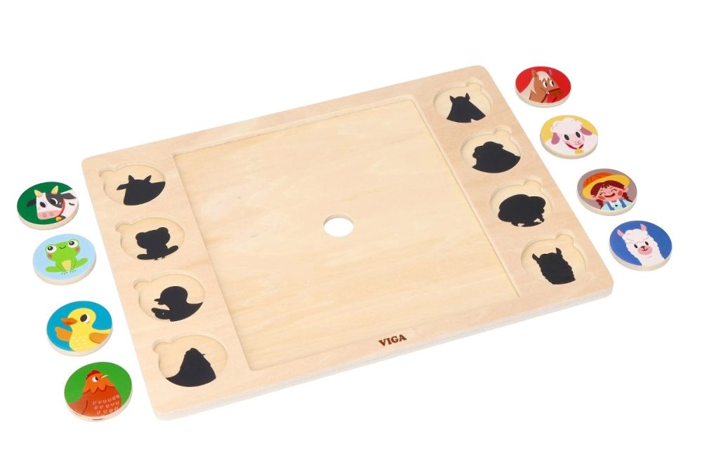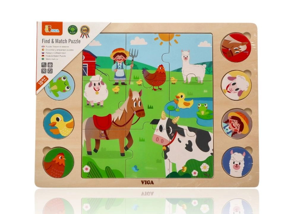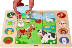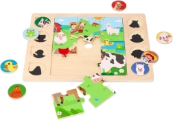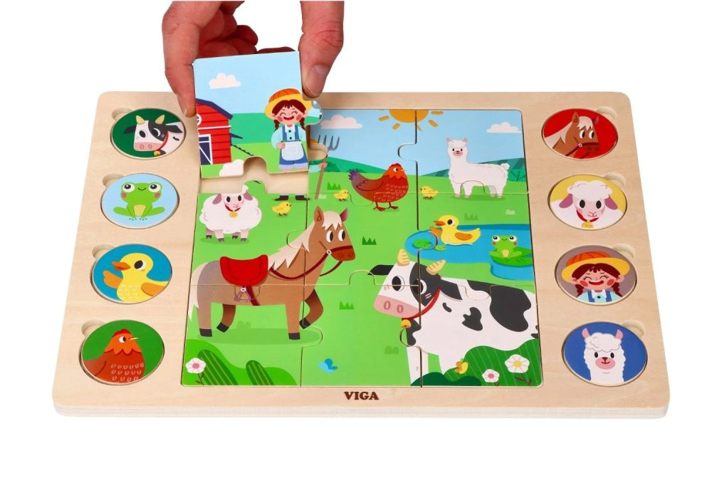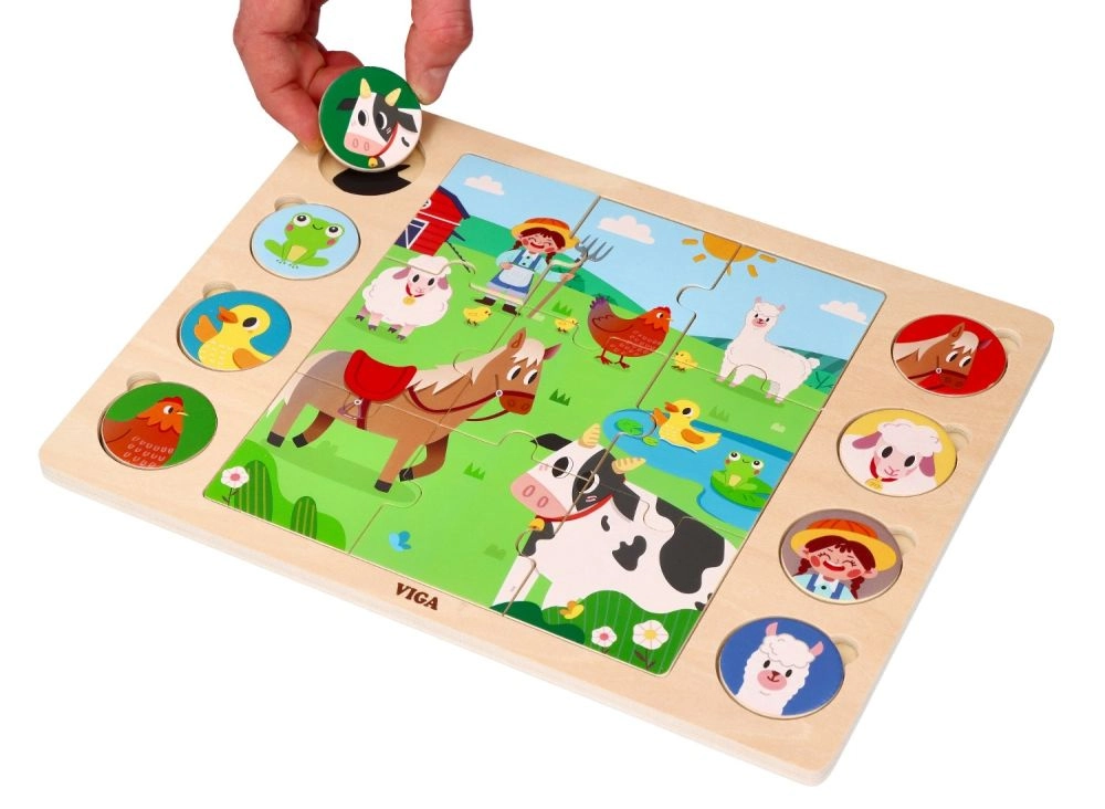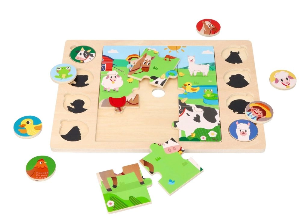 Αυτό το έξυπνο παζλ συνδυάζει δύο δραστηριότητες: πρώτα τα παιδιά συναρμολογούν την κεντρική εικόνα από 9 μεγάλα κομμάτια, στη συνέχεια αντιστοιχίζουν 8 στρογγυλά κουπόνια με ζωάκια στις αντίστοιχες σκιές πάνω στη βάση. Το παιχνίδι υποστηρίζει φυσικά τον εμπλουτισμό του λεξιλογίου – μετά την ολοκλήρωση της συναρμολόγησης, τα παιδιά μπορούν να ονομάζουν τα ζώα και να τα αναζητούν στη μεγάλη εικόνα της φάρμας.