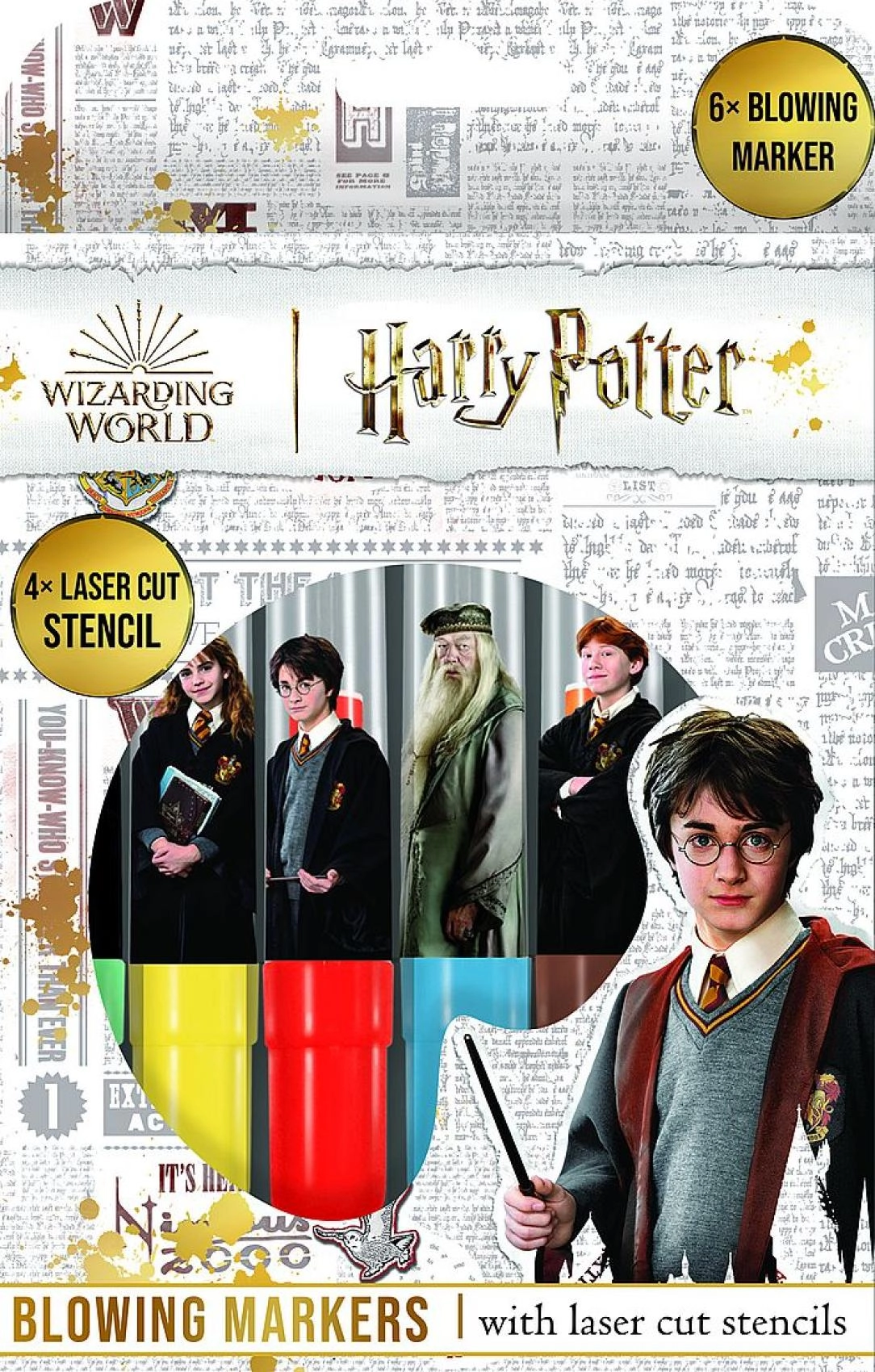 Δημιούργησε τα δικά σου μαγικά σχέδια με μαρκαδόρους φυσήματος εμπνευσμένους από τον κόσμο του Harry Potter. Το σετ περιλαμβάνει 6 χρωματιστούς μαρκαδόρους φυσήματος και στένσιλ με εμβληματικά μοτίβα – τους κοιτώνες του Χόγκουαρτς, τα κειμήλια του θανάτου, το χρυσό κουκί (snitch) ή τα γυαλιά με την ουλή. Αρκεί να τοποθετήσεις τον μαρκαδόρο στη θήκη, να φυσήξεις και να δημιουργήσεις εφέ σπρέι σε δευτερόλεπτα.