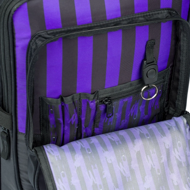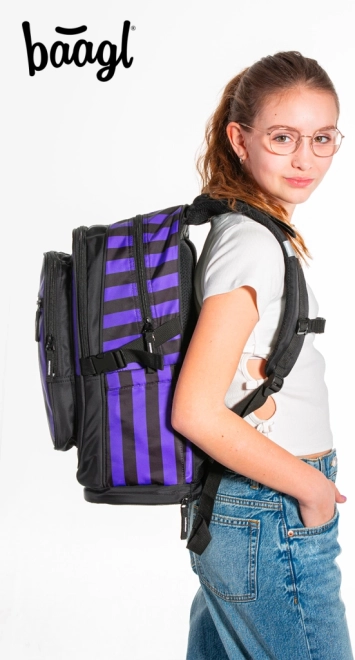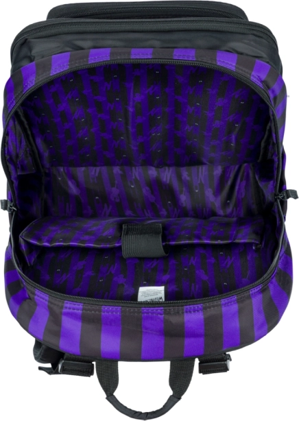 Η σχολική τσάντα CUBIC WEDNESDAY συνδυάζει έντονο σχεδιασμό σε μαύρες-μοβ ρίγες με μελετημένη εργονομία για καθημερινή άνεση. Χάρη στους πλήρως ρυθμιζόμενους ιμάντες ώμου, στήθους και πλευρικούς συμπιεστικούς ιμάντες, η τσάντα προσαρμόζεται εύκολα στο σώμα, ενώ η αναπνεύσιμη πλάτη διευκολύνει τη μεταφορά ακόμη και σε πλήρες φορτίο.