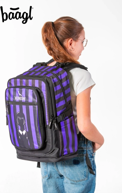 Στιλάτη σχολική τσάντα της σειράς CUBIC εμπνευσμένη από το μοτίβο WEDNESDAY προσφέρει εργονομικά διαμορφωμένη πλάτη, χαμηλό βάρος 1,2 kg και όγκο 29 l. Τρεις θήκες με οργανωτή και θήκη για φορητό υπολογιστή 15", ανακλαστικά στοιχεία για ασφάλεια και ανθεκτικό αδιάβροχο υλικό την καθιστούν ιδανική επιλογή για το σχολείο και τον ελεύθερο χρόνο.