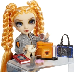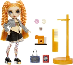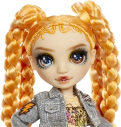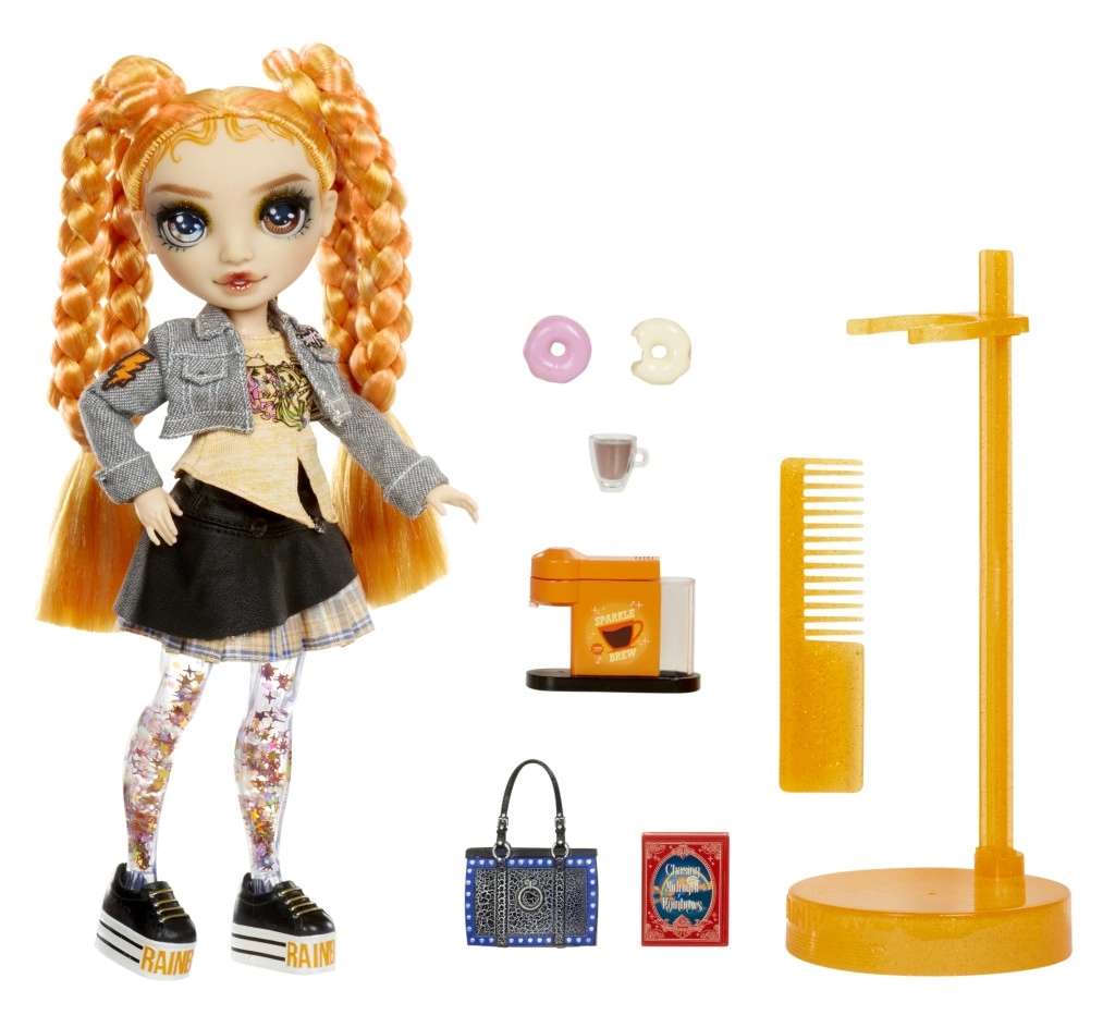 Η κούκλα RAINBOW HIGH Sparkle & Shine Clementine προσφέρει έντονο πορτοκαλί look, τζιν ζακέτα, καρό φούστα και πλατφόρμα παπούτσια με την επιγραφή RAINBOW. Περιλαμβάνονται βάση στήριξης, χτένα και θεματικά αξεσουάρ καφέ που επεκτείνουν τις δυνατότητες παιχνιδιού και τις ιστορίες.