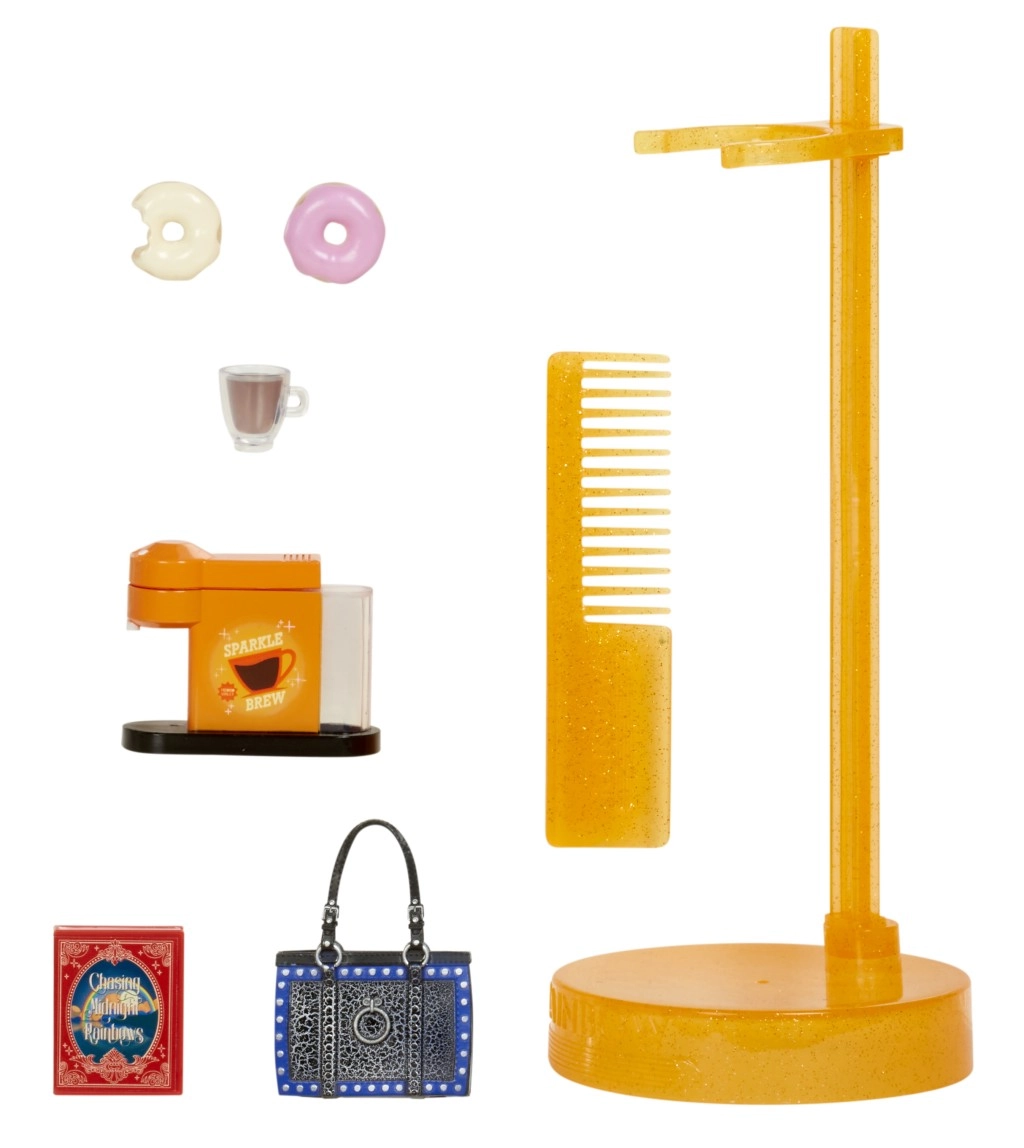 - Πλούσια αξεσουάρ – τσάντα, χτένα, βάση στήριξης, μηχάνημα καφέ “Sparkle Brew”, ποτηράκι και γλυκά αξεσουάρ.