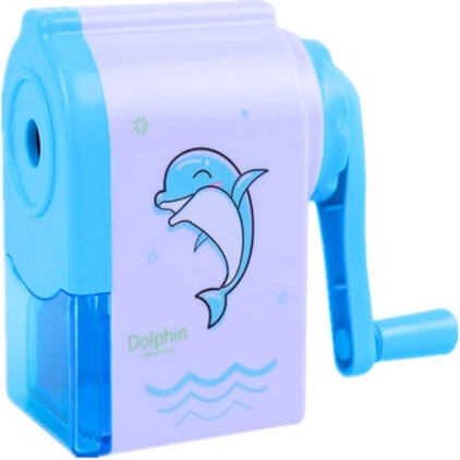 Μολυβοξυστής με μανιβέλα με σχέδιο δελφίνι σε ανοιχτό μπλε χρώμα, ένας πρακτικός βοηθός για παιδιά. Διευκολύνει το γρήγορο και εύκολο ξύσιμο μολυβιών και ξυλομπογιών χωρίς μεγάλη προσπάθεια.