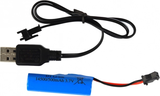 Το τηλεχειριστήριο στη συχνότητα 27 MHz επιτρέπει πλήρη έλεγχο: κίνηση εμπρός/πίσω και στροφή αριστερά/δεξιά. Η επαναφορτιζόμενη μπαταρία 3,7 V 500 mAh εξασφαλίζει έως 30 λεπτά οδήγησης, ενώ η φόρτιση μέσω του παρεχόμενου φορτιστή USB διαρκεί περίπου 2 ώρες. Το μοντέλο πληροί τα πρότυπα CE και EN71.