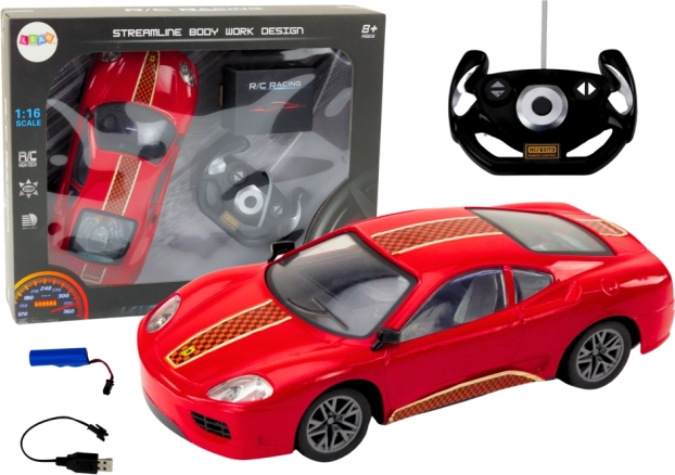 Κόκκινο τηλεκατευθυνόμενο αυτοκίνητο με μαύρες και πορτοκαλί λεπτομέρειες που θυμίζει πραγματικό σπορ αυτοκίνητο με αεροδυναμικό σχεδιασμό.