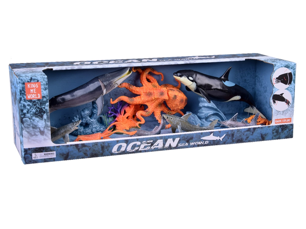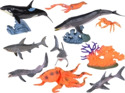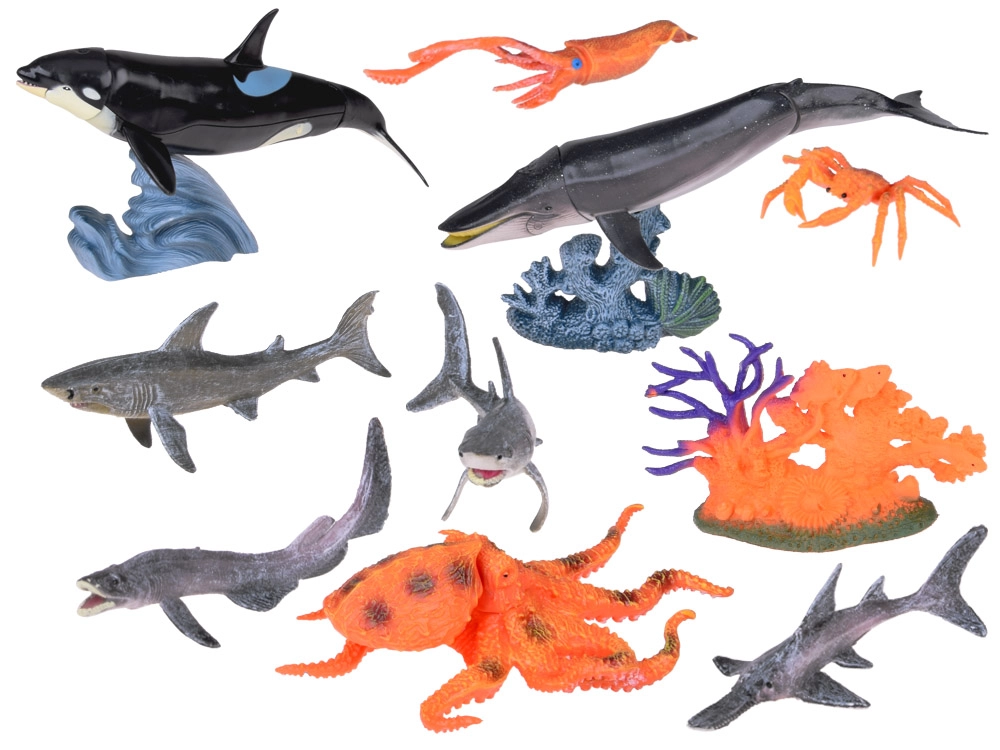 Το σετ περιλαμβάνει διάφορα είδη θαλάσσιων πλασμάτων, όπως φάλαινα, χταπόδι, όρκα, καρχαρία και άλλα.