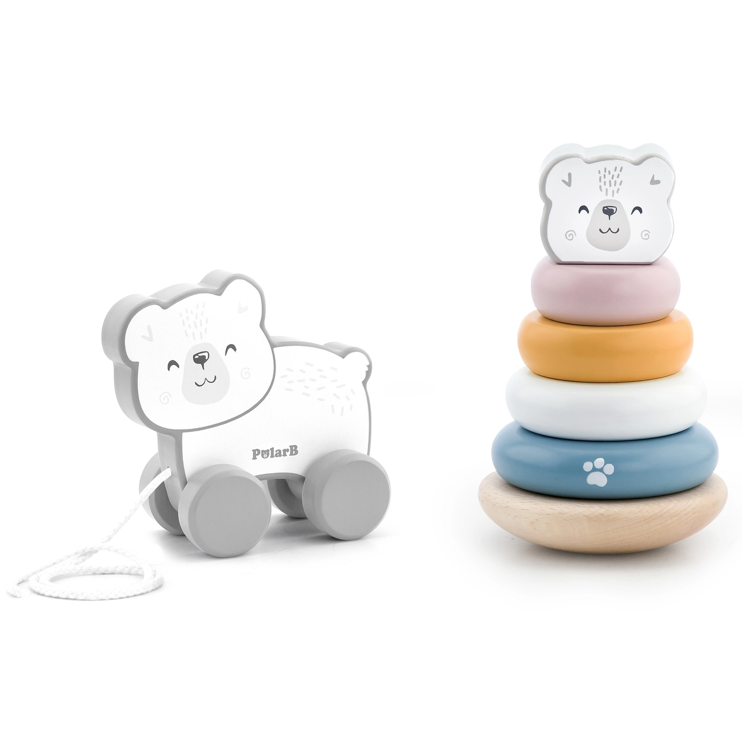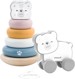Ένα στιλάτο σετ από τη Viga της συλλογής PolarB φέρνει δύο παστέλ ξύλινα παιχνίδια: μια εκπαιδευτική πυραμίδα με πολική αρκούδα και ένα χαριτωμένο συρόμενο αρκουδάκι. Υποστηρίζει τη λεπτή κινητικότητα, τη λογική σκέψη, τον συντονισμό χεριού–ματιού και την εκμάθηση χρωμάτων, ενώ παράλληλα προσφέρει καθημερινή διασκέδαση.