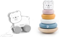 Το παιχνίδι με την πυραμίδα αναπτύσσει τη λογική, την υπομονή και την αναγνώριση χρωμάτων, ενώ το συρόμενο αρκουδάκι υποστηρίζει φυσικά το βάδισμα και τις δεξιότητες συντονισμού. Και τα δύο παιχνίδια είναι κατασκευασμένα από ποιοτικό ξύλο με λείες άκρες για ασφαλή χρήση.