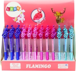 Ανακαλύψτε το κομψό στυλό διαρκείας με διακοσμητικό φλαμίνγκο, που συνδυάζει πρακτική γραφή με πρωτότυπο σχεδιασμό. Η διάφανη θήκη γεμισμένη με μικρές “διαμαντένιες” πέτρες λαμποκοπά με την κίνηση και προσθέτει στη συλλογή σας μια μοναδική εμφάνιση. Χάρη στο μπλε μελάνι 0,7 mm, το στυλό είναι ιδανικό για καθημερινές σημειώσεις, υπογραφές και σχολικά γράψιμα.