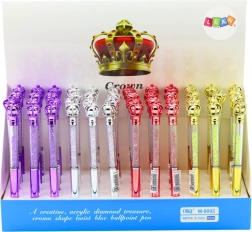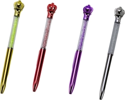 Κομψό στυλό διαρκείας με διακοσμητική κορώνα και διάφανο σώμα γεμάτο με λαμπερές πετρούλες. Προσφέρει μπλε μελάνι, μύτη 0,7 mm για ομαλή γραφή και πολυτελή εμφάνιση για καθημερινή χρήση ή δώρο. Διαθέσιμο σε μίξη χρωμάτων.