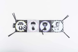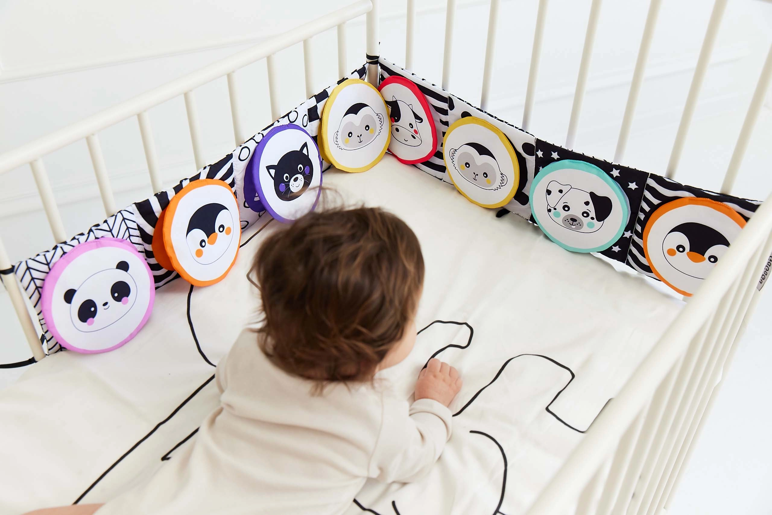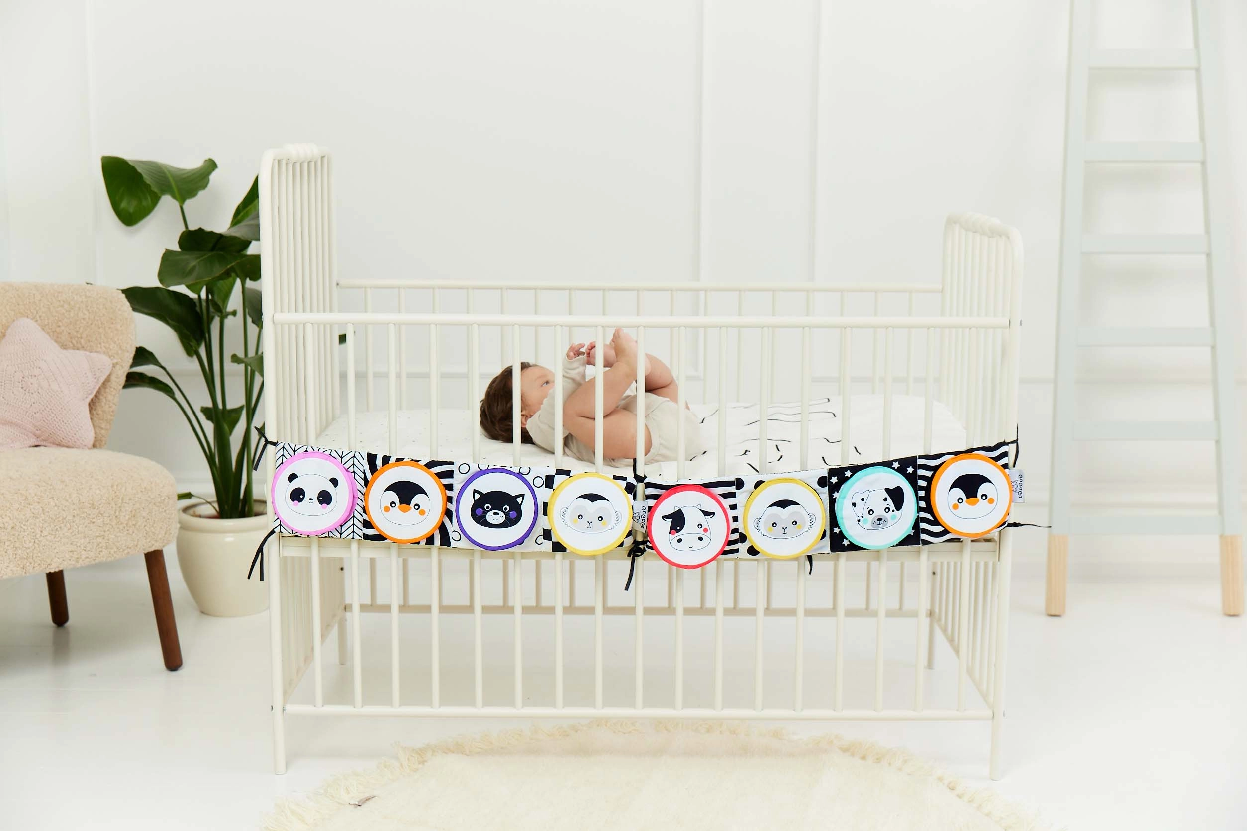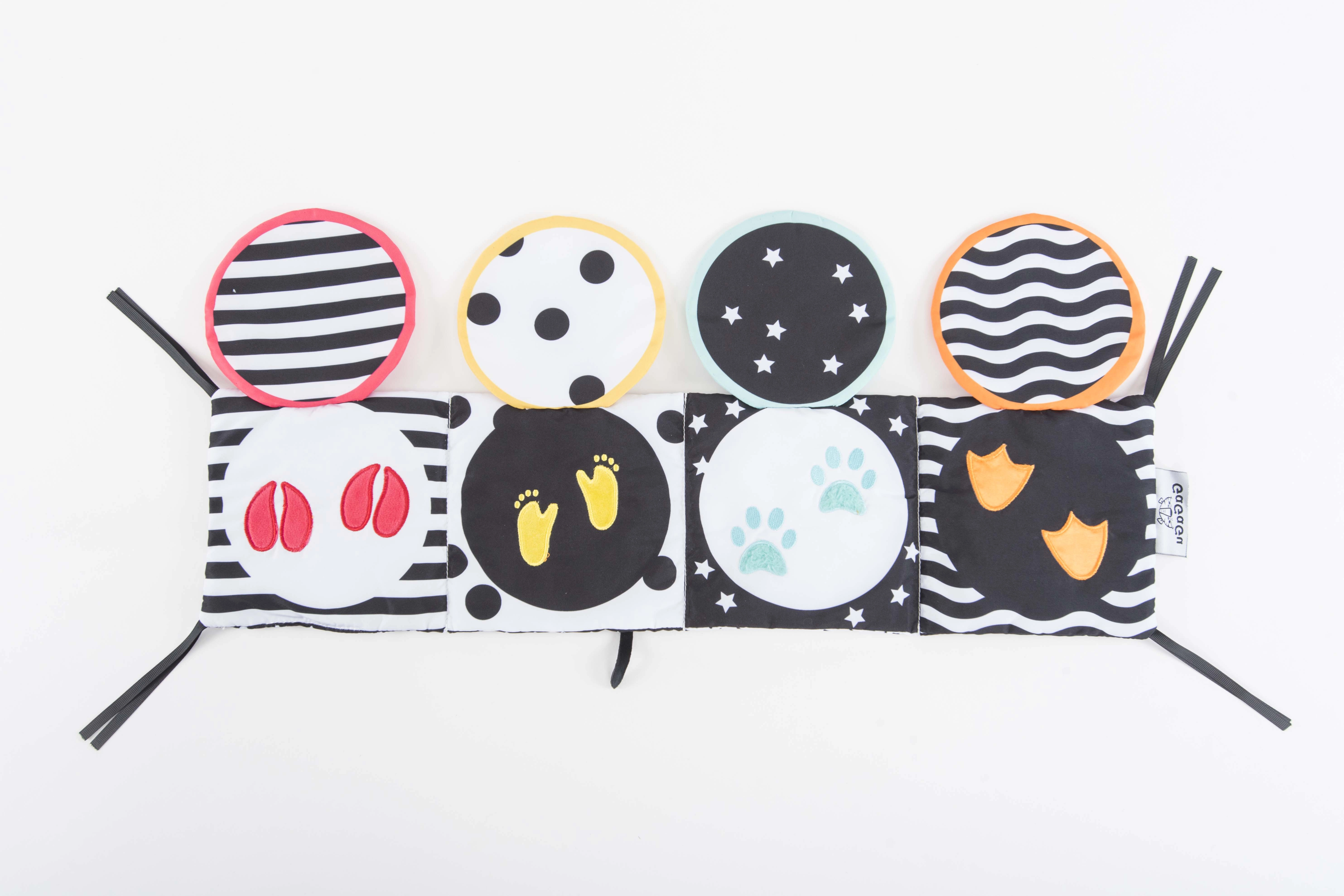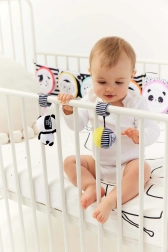 Μπορεί να προσαρτηθεί εύκολα στο κρεβατάκι ή στο καρότσι χάρη στις κορδέλες, ενώ η ελαφριά κατασκευή του το καθιστά ιδανικό για ταξίδια. Βοηθά στην ανάπτυξη της όρασης και της αφής, μαζί με βασικές γνώσεις για τα ζώα.