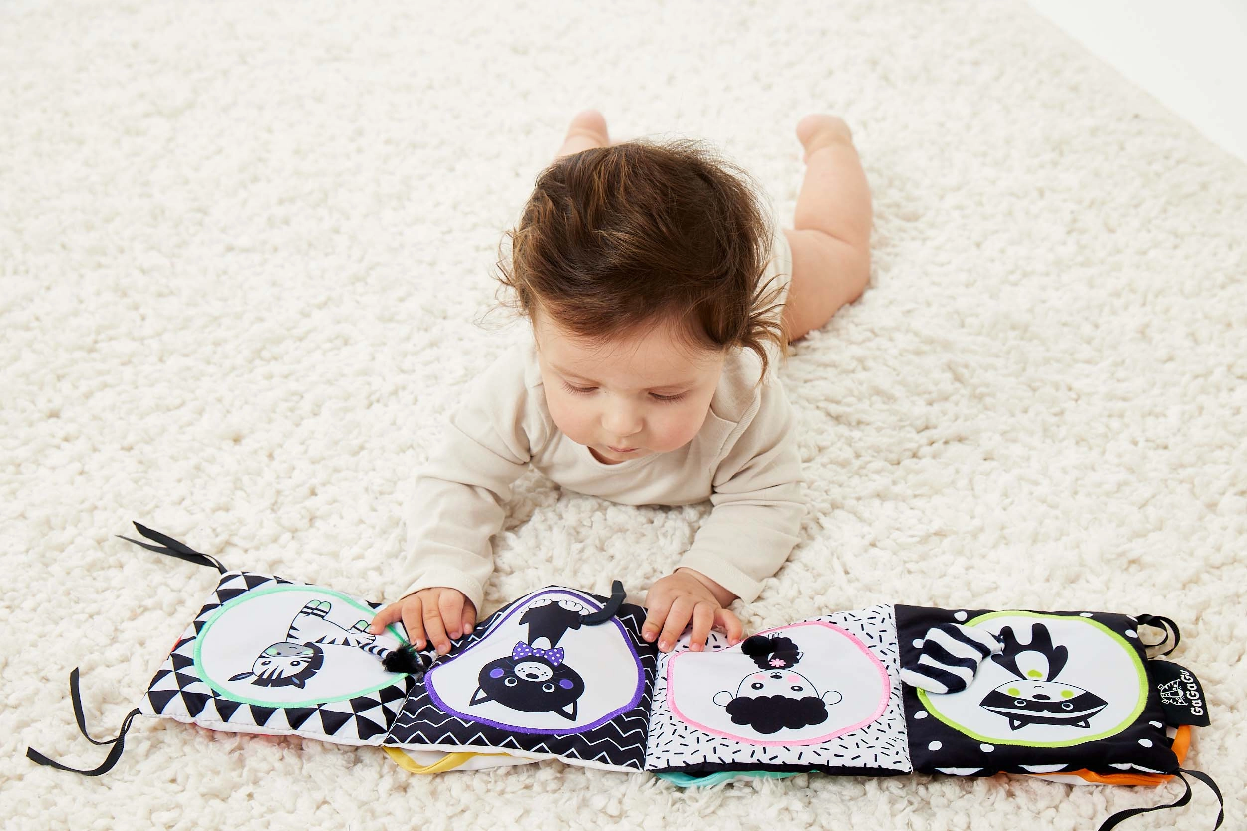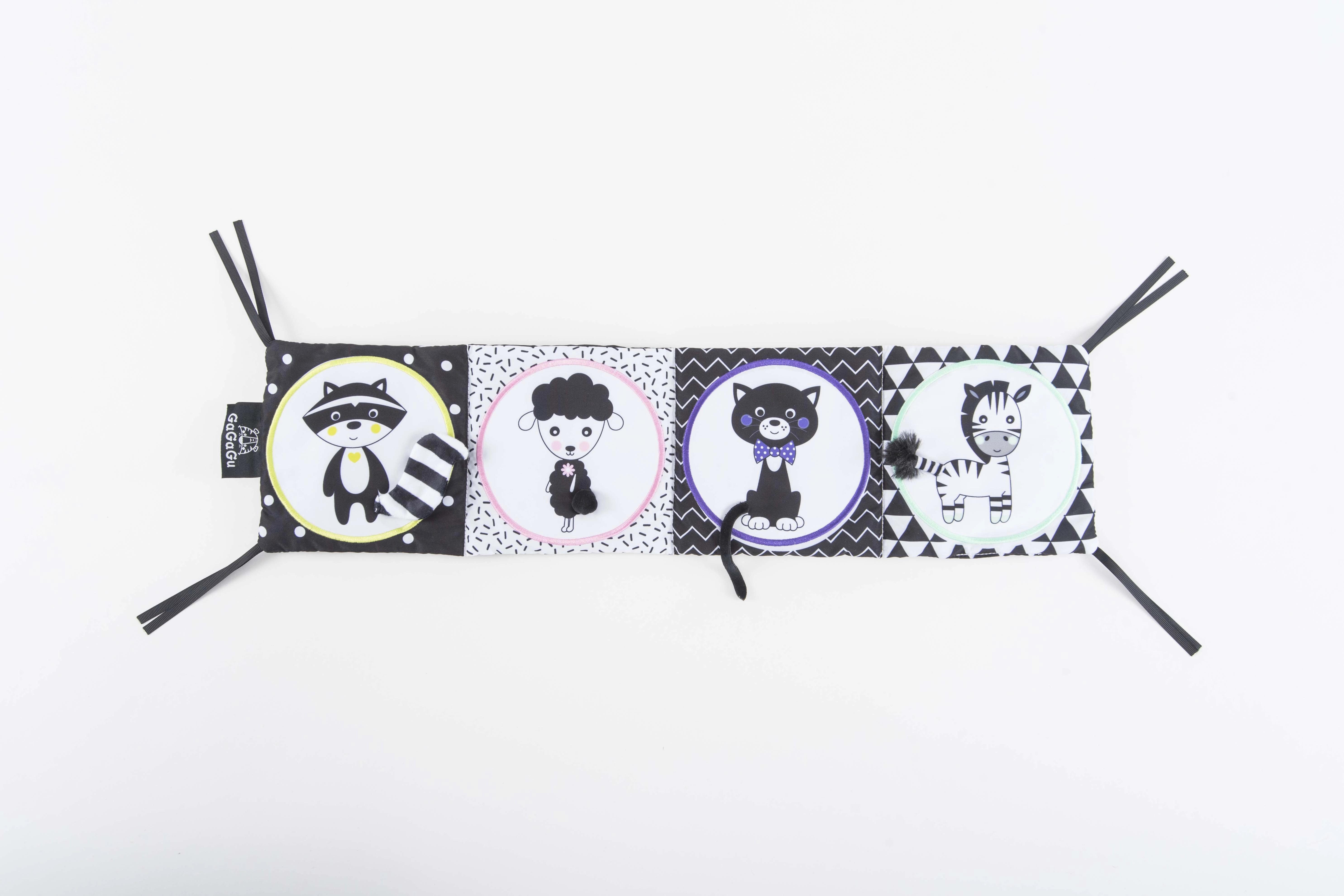 Το βιβλίο είναι διπλής όψης και προσφέρει δύο διαφορετικές οπτικές εμπειρίες χάρη στα κεντημένα στοιχεία και τις έντονες, σε αντίθεση, εικονογραφήσεις ζώων. Οι λούτρινες κουρτινούλες προσθέτουν μια ακόμη διάσταση διασκέδασης, τσαλακώνουν στο άγγιγμα και βοηθούν τα παιδιά να μαθαίνουν νέα σχήματα και χρώματα.
