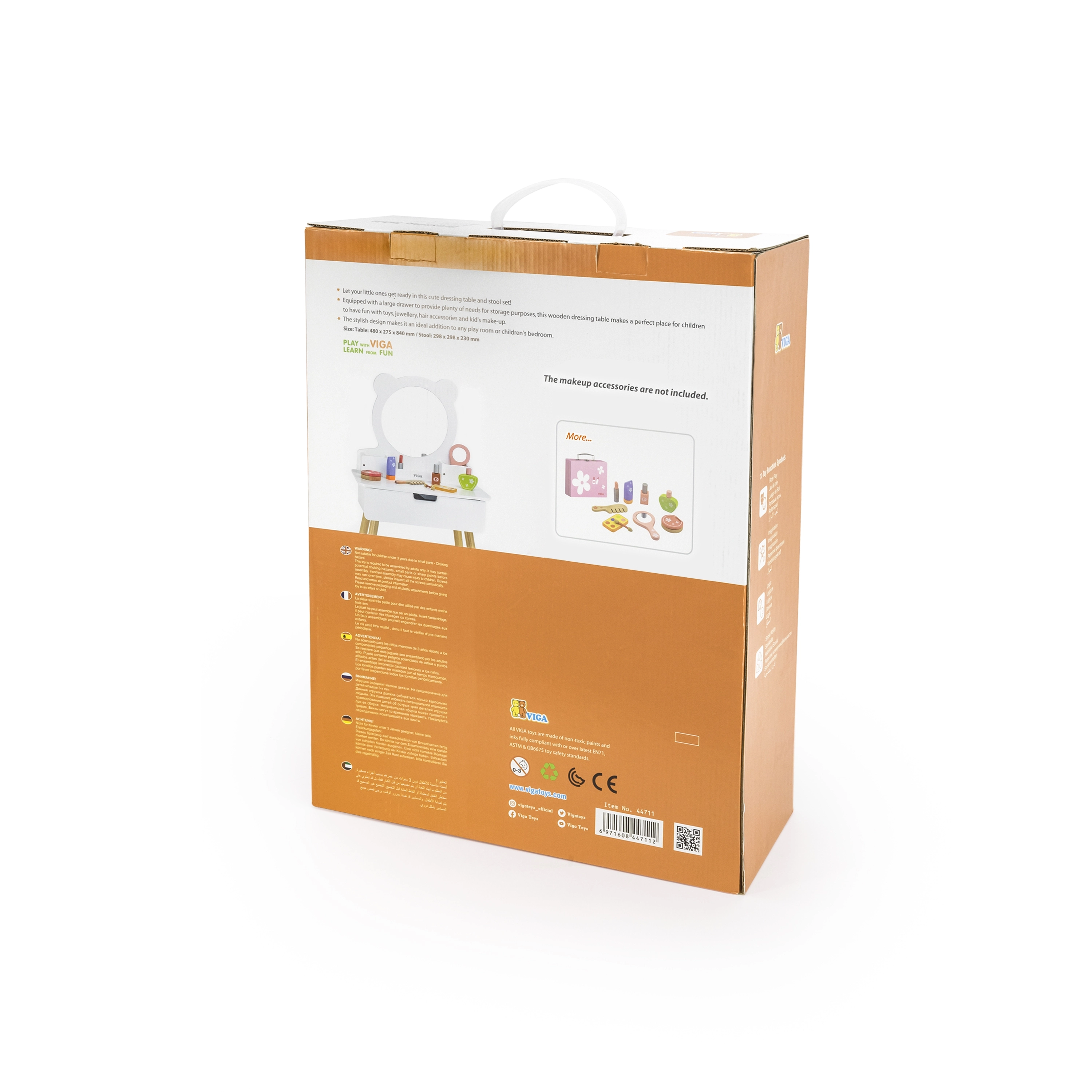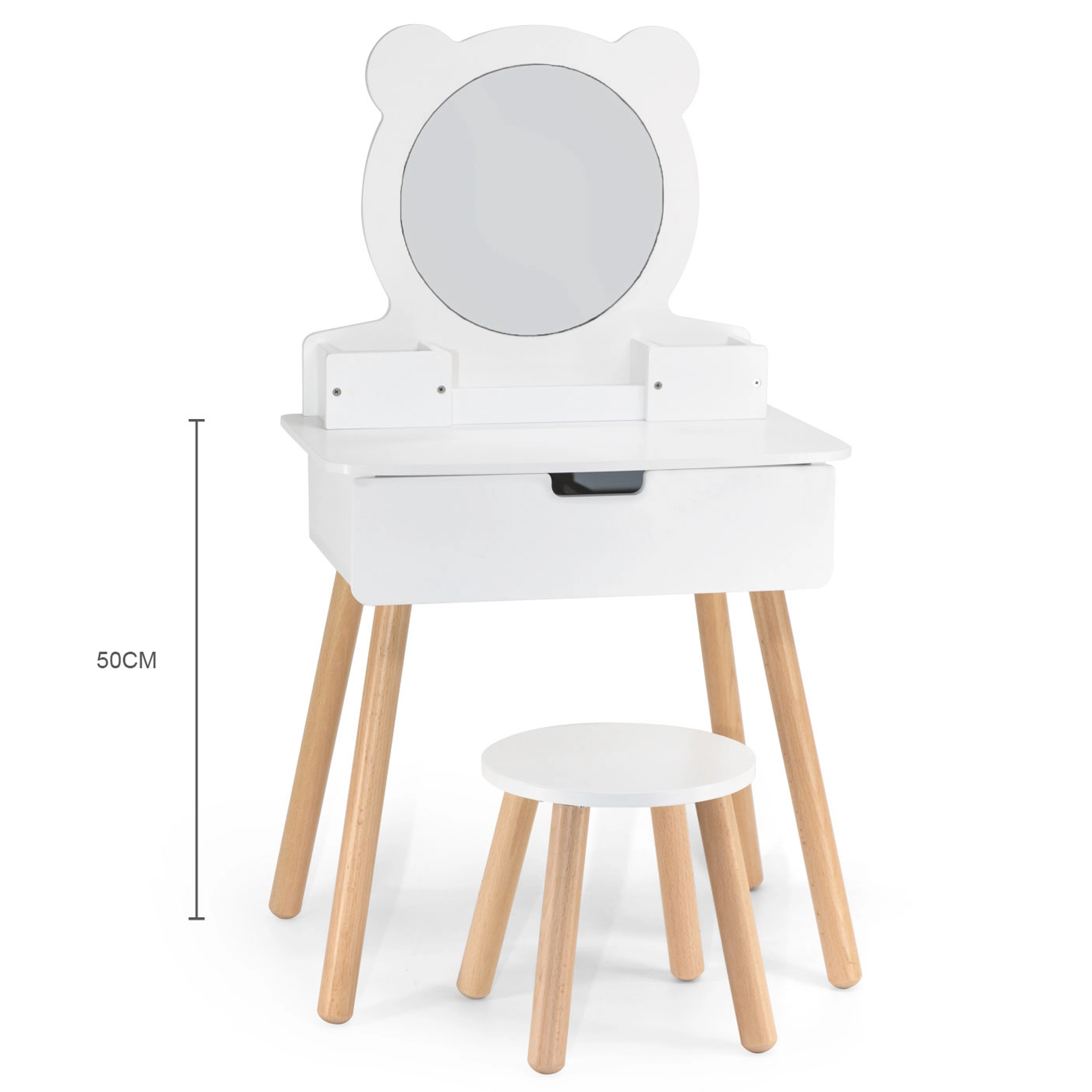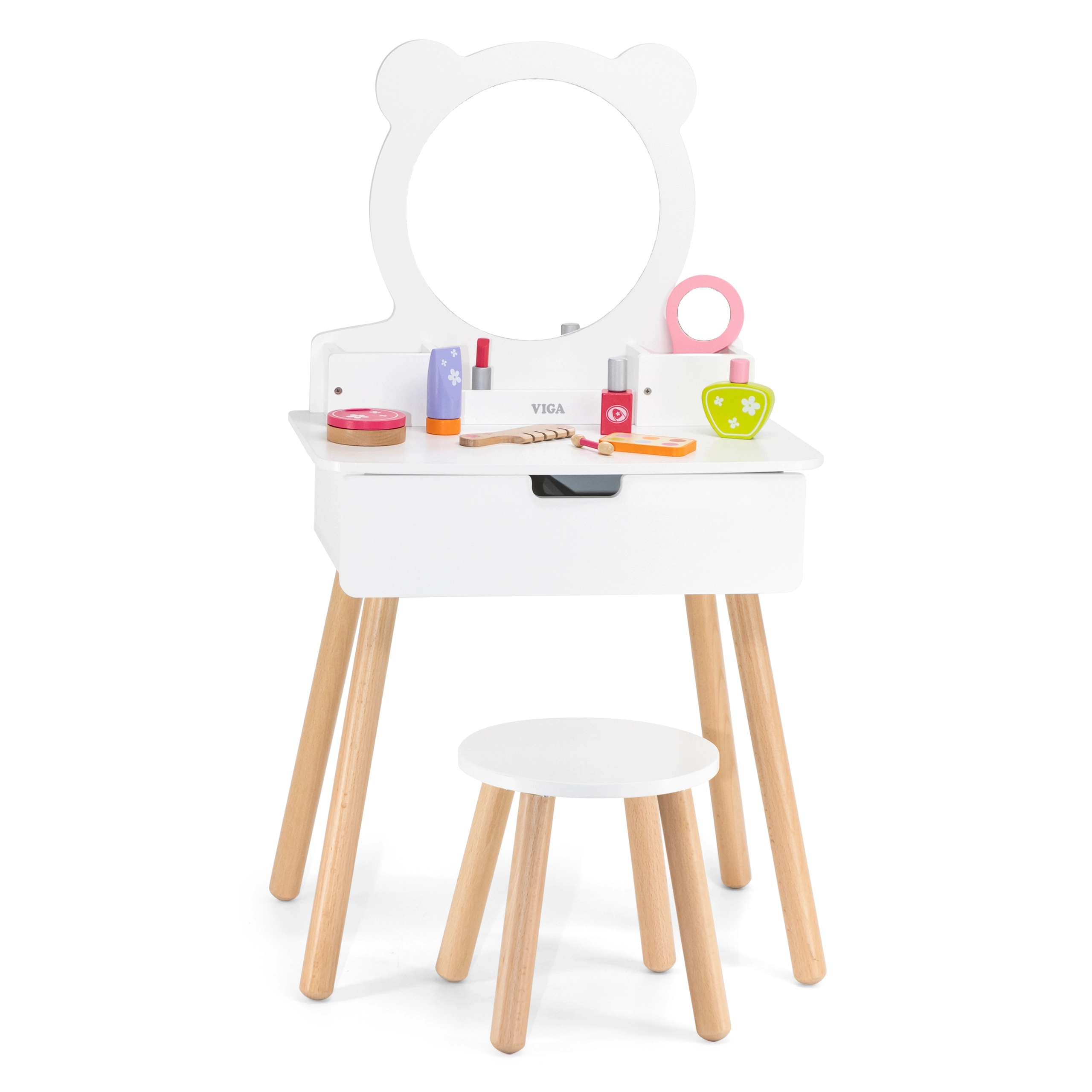 Η τουαλέτα της VIGA είναι εξοπλισμένη με καθρέφτη σε σχήμα αρκούδας και διαθέτει πρακτικούς χώρους αποθήκευσης που ενθαρρύνουν τα παιδιά σε δημιουργικό παιχνίδι. Έχει ξύλινα πόδια και κομψό λευκό χρώμα που θα εντυπωσιάσει κάθε μικρή δεσποινίδα.