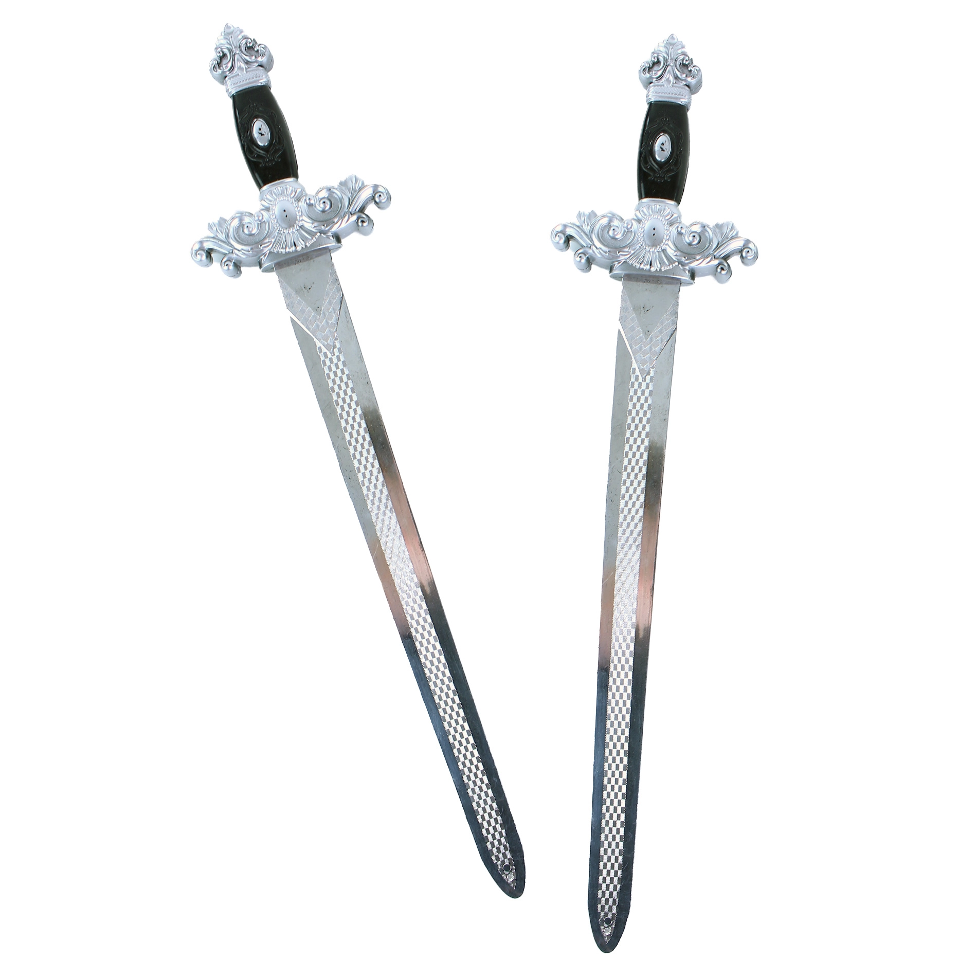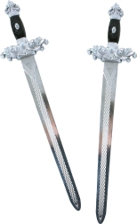 Στο σετ περιλαμβάνονται 2 πανομοιότυπα ασημένια σπαθιά μήκους 49 εκ. με διακοσμημένες λαβές – ιδανικά για μονομαχία ή παιχνίδι σε ζευγάρι.