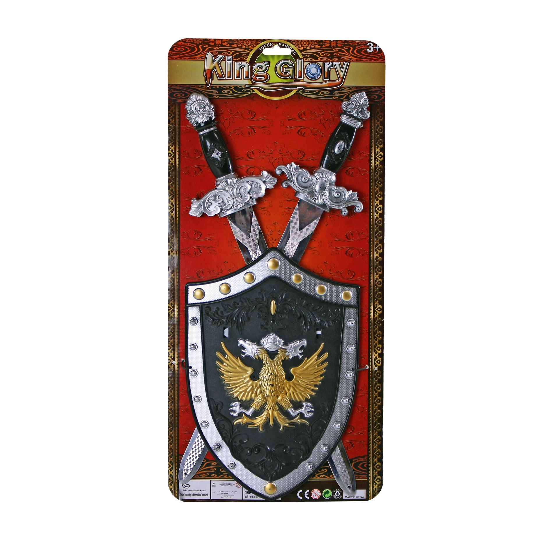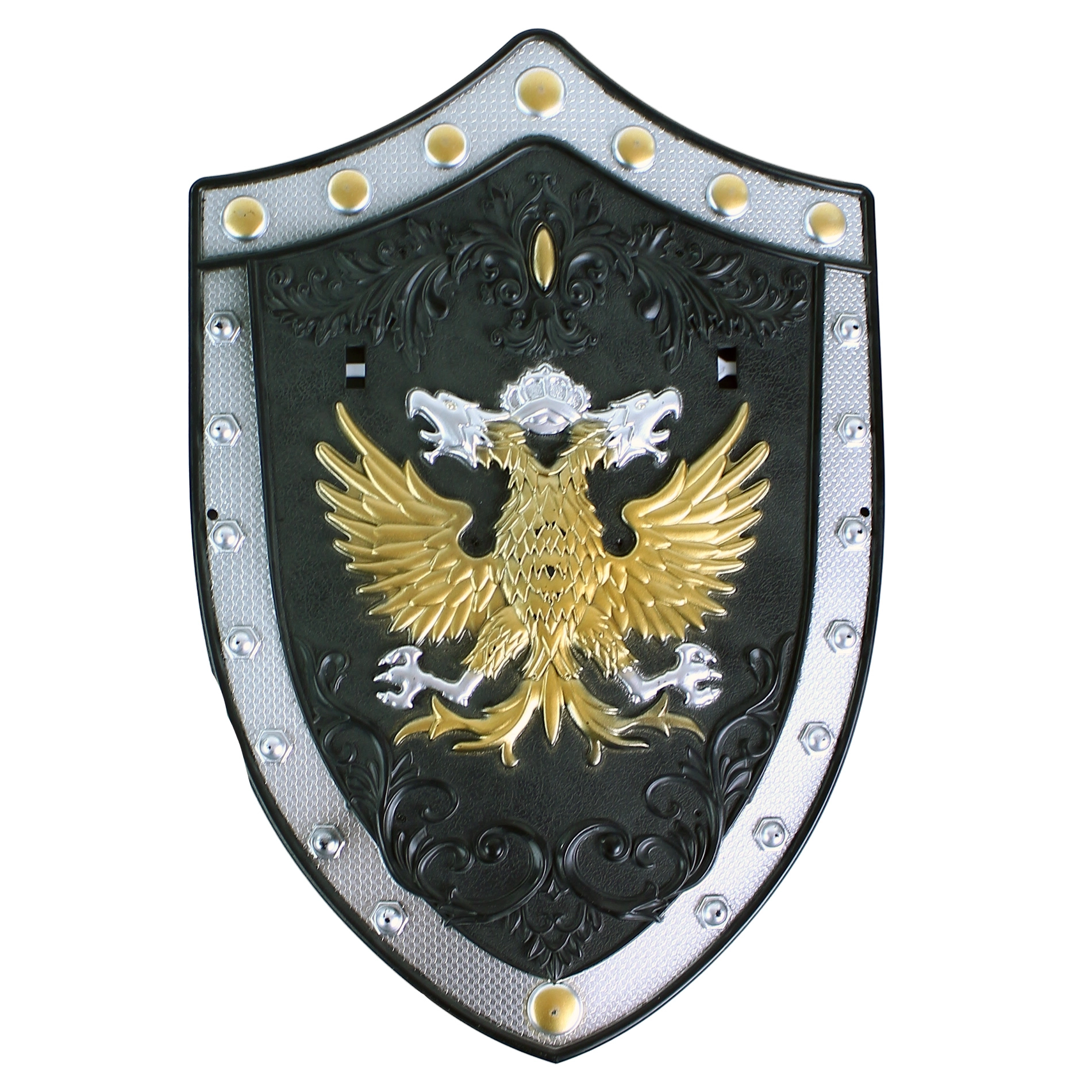 Η ασπίδα με τον έντονο χρυσό δικέφαλο αετό και τα διακοσμητικά μοτίβα χαρίζει στον ιπποτικό εξοπλισμό αυθεντική εμφάνιση και προστασία σε κάθε μάχη.