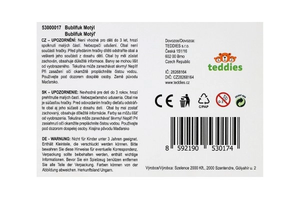 Η σαπουνόφουσκα σε σχήμα πεταλούδας είναι το ιδανικό παιχνίδι που θα κεντρίσει το ενδιαφέρον των παιδιών όχι μόνο με την ουράνιο-τόξο ομορφιά της, αλλά και με την απλότητα χρήσης. Στο επάνω μέρος υπάρχει επιπλέον ένα διασκεδαστικό παιχνίδι-γρίφος με μπίλια, που συμβάλλει στην ανάπτυξη της λεπτής κινητικότητας των παιδιών.
