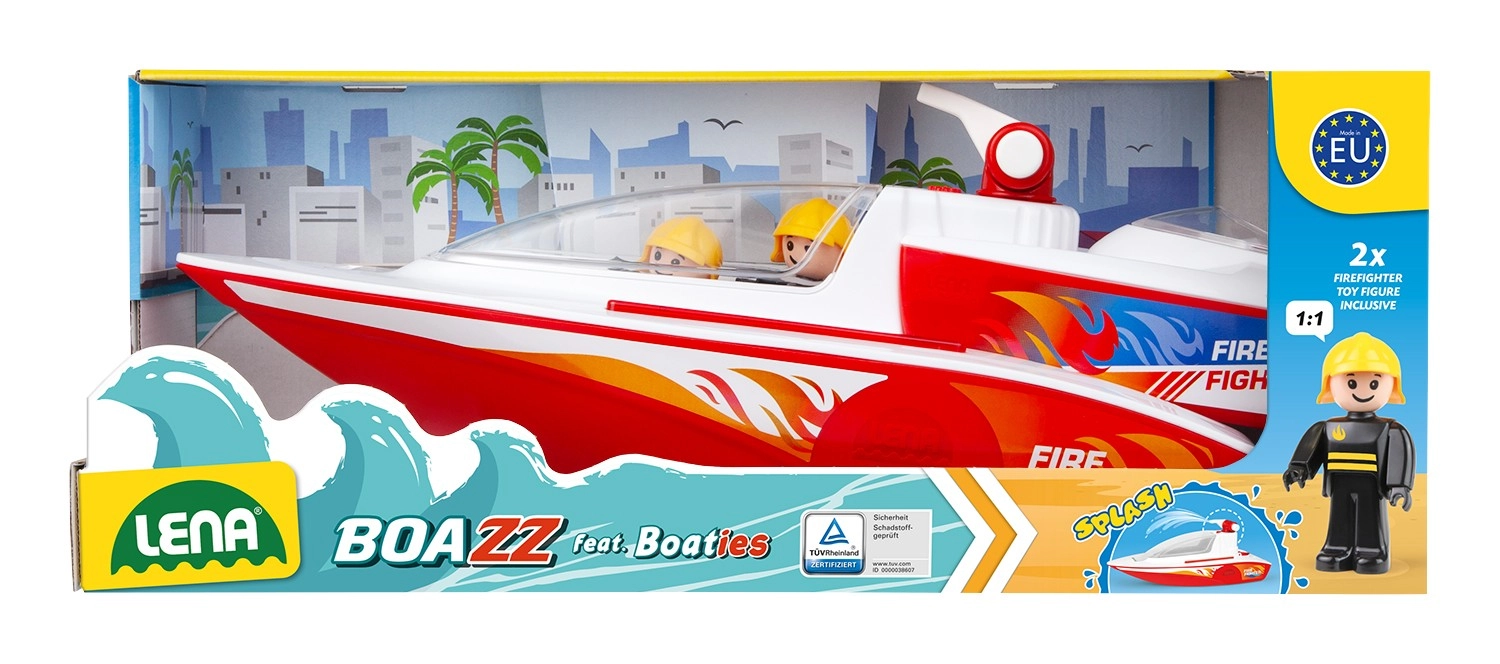 Απολαύστε μια διπλή δόση διασκέδασης στο νερό και στη στεριά με την πυροσβεστική λέμβο BOAZZ και το καταμαράν. Περιλαμβάνει 2 φιγούρες για ρεαλιστικό παιχνίδι και λειτουργικό υδροβόλο για εκτόξευση νερού. Το παιχνίδι είναι κατάλληλο για εσωτερικό και εξωτερικό χώρο και, χάρη στην πλευστή γάστρα, προσφέρει φανταστική δράση στη μπανιέρα, τη μικρή πισίνα ή στη λιμνούλα.