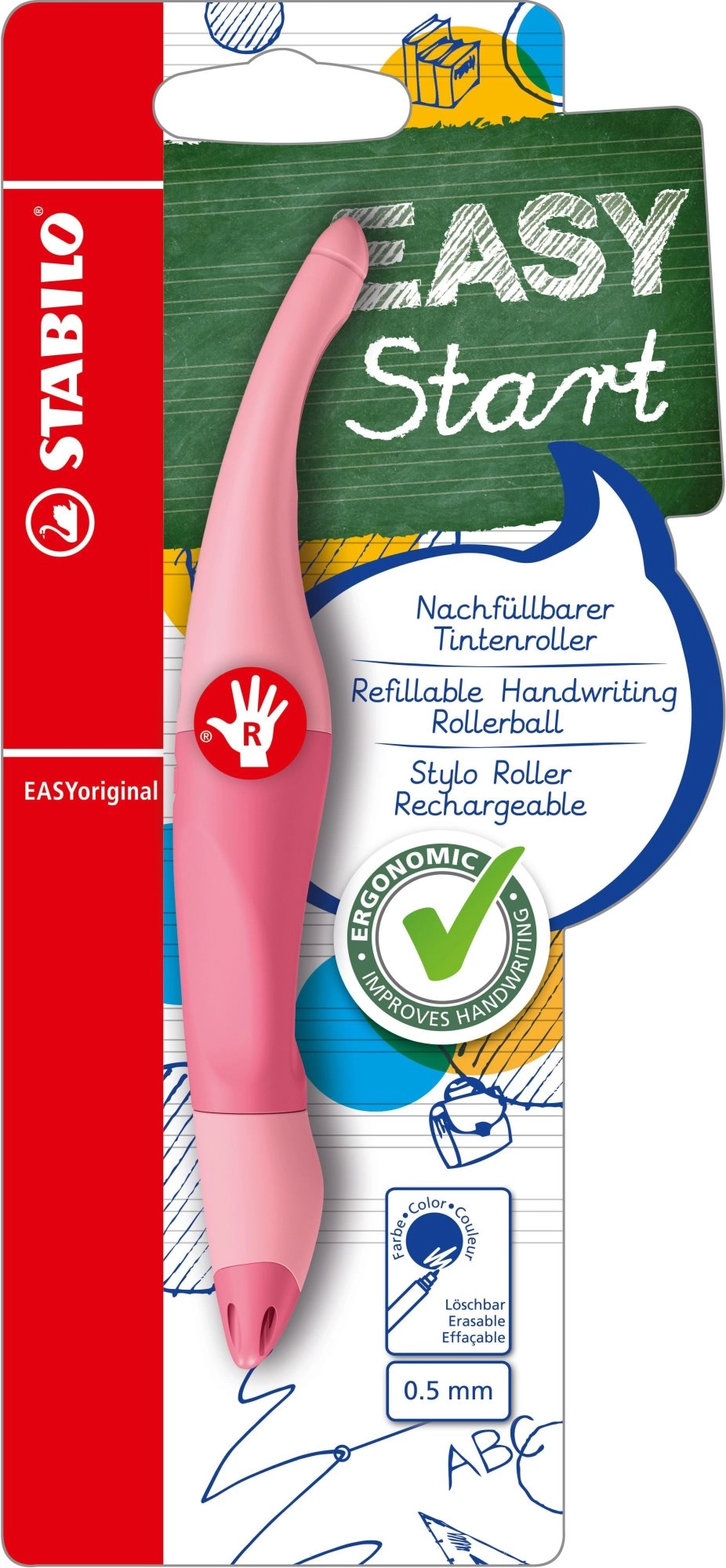 Το STABILO EASYoriginal είναι ένα δημοφιλές σχολικό στυλό σχεδιασμένο ειδικά για δεξιόχειρες. Το εργονομικά διαμορφωμένο σώμα και τα αντιολισθητικά σημεία λαβής βοηθούν τα παιδιά να αποκτήσουν σωστό κράτημα και άνετη γραφή. Ο ρόλερ προσφέρει καθαρή και ομοιόμορφη γραμμή χωρίς γρατζουνιές και χωρίς μουτζούρες.