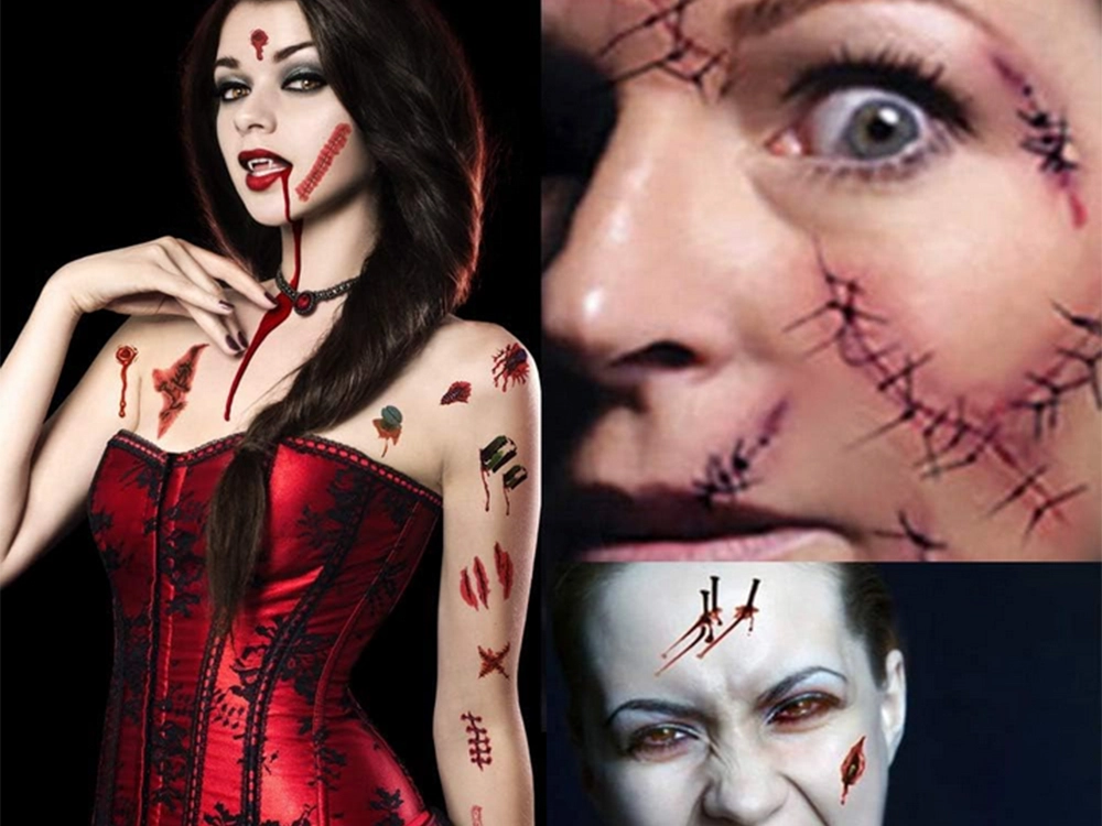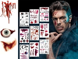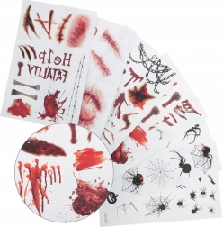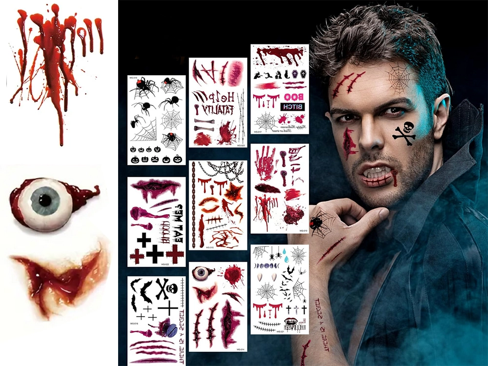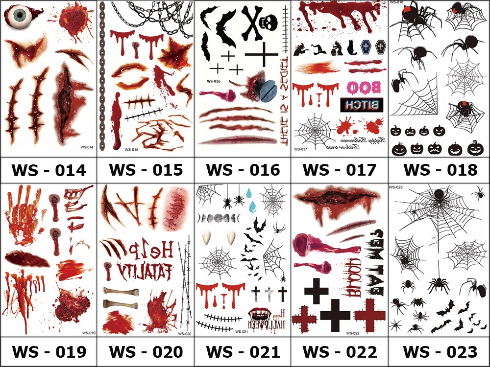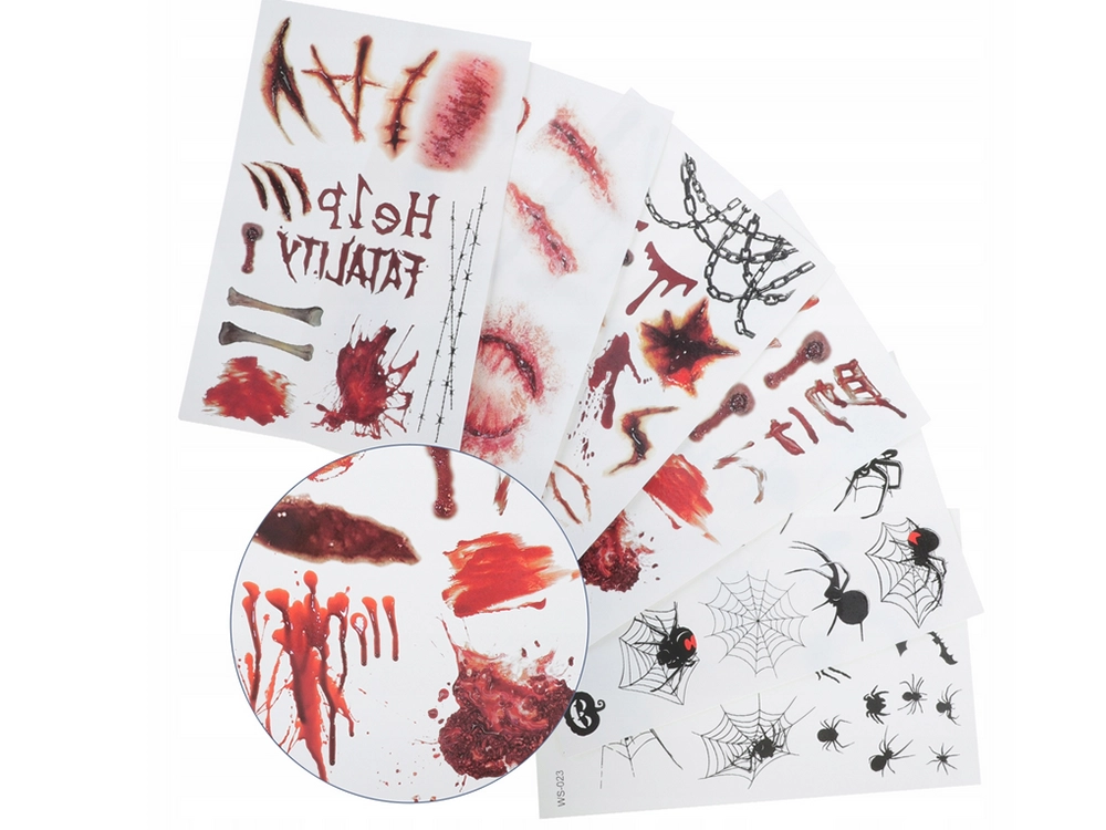 Χάρη στην πλούσια γκάμα μοτίβων, ολοκληρώνετε εύκολα το μακιγιάζ για Halloween, θεματικά πάρτι ή φωτογραφίσεις. Κάθε φύλλο προσφέρει ένα μίξ από τρομακτικά σχέδια, από αιματηρές πιτσιλιές και ιστούς έως βαθιές ουλές – για μέγιστο ρεαλιστικό αποτέλεσμα.