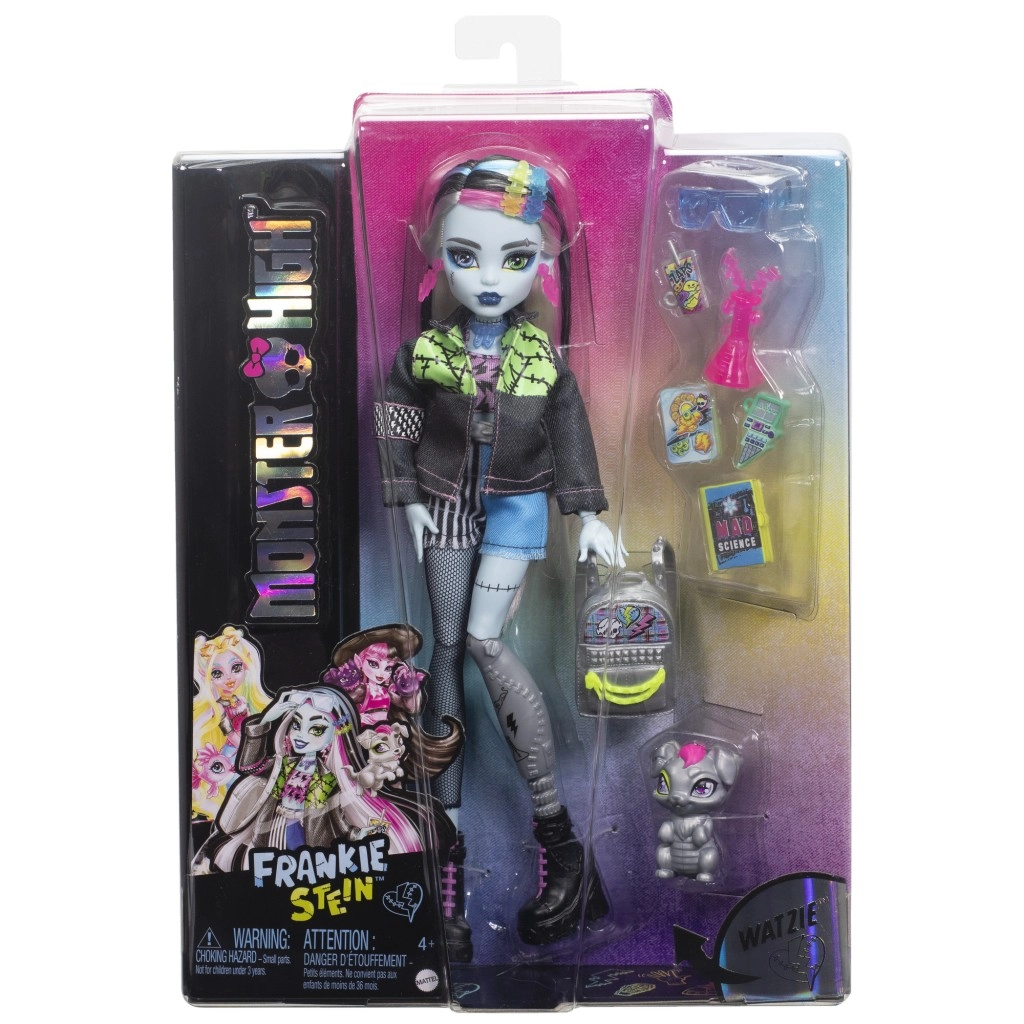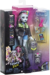 Γνωρίστε τη χαρακτηριστική μαθήτρια της MONSTER HIGH – Frankie Stein. Αυτή η κούκλα ξεχωρίζει με έναν εντυπωσιακό συνδυασμό punk και techno στυλ: τζιν μπουφάν, σορτς, έντονα σκουλαρίκια σε σχήμα αστραπών και μαύρες μποτάκια με ροζ κορδόνια. Χάρη στους αρθρώσεις για ρύθμιση πόζας δημιουργείτε εύκολα cool σκηνές και ιστορίες.