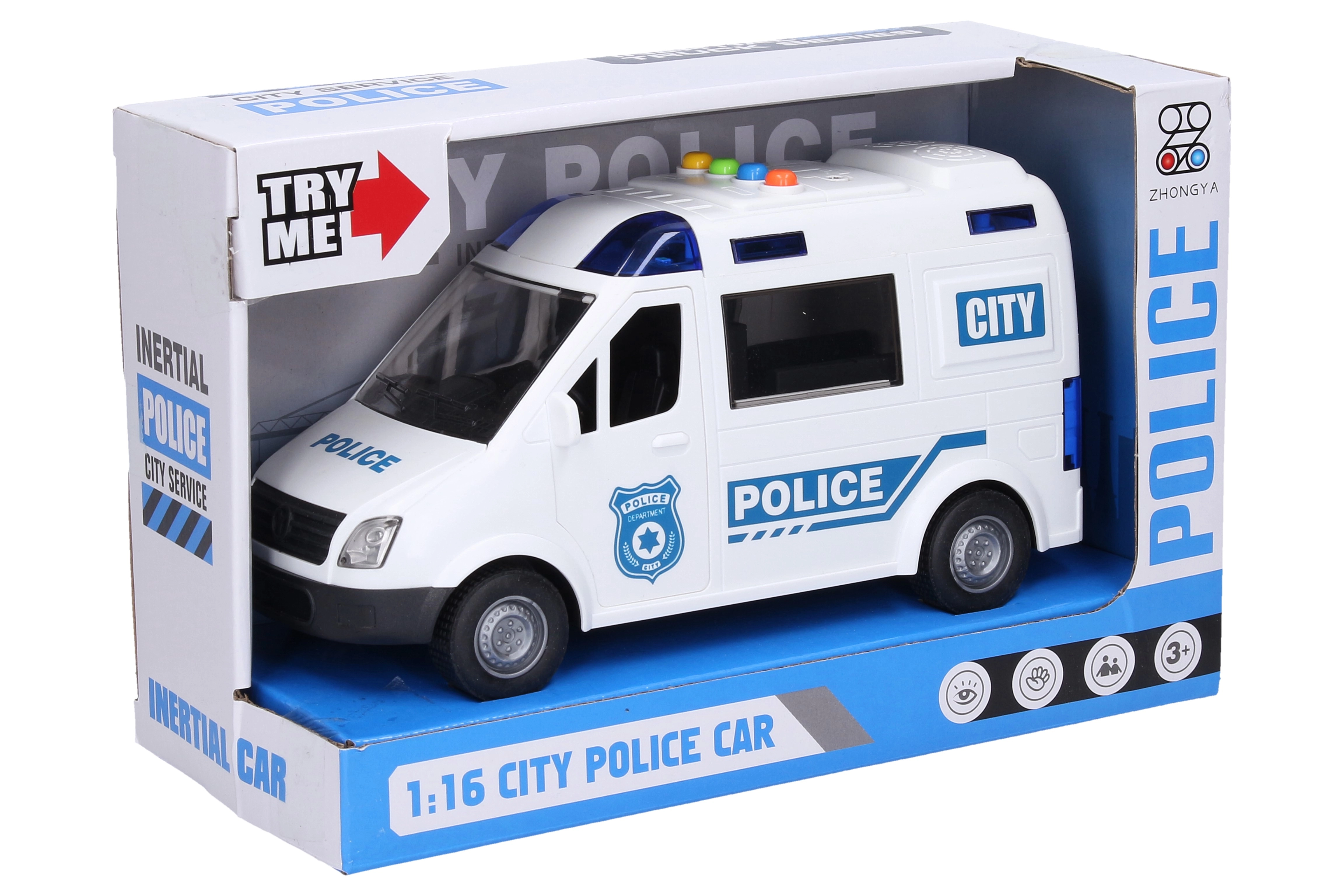 Αυτό το αστυνομικό αυτοκίνητο είναι εξοπλισμένο με φωτεινά και ηχητικά εφέ, που ενεργοποιούνται με κουμπιά στην καμπίνα. Τα παιδιά θα απολαύσουν ρεαλιστικό παιχνίδι χάρη στις ανοιγόμενες μπροστινές και πίσω πόρτες. Το αυτοκίνητο κινείται με αδρανειακό μηχανισμό, που εξασφαλίζει ομαλή κίνηση.