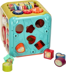 Ο ταξινομητής σχημάτων, τα περιστροφικά και συρόμενα στοιχεία εξασκούν τη λαβή, τον συντονισμό και την επίλυση προβλημάτων. Πολύχρωμα τουβλάκια και αριθμοί ενισχύουν την αναγνώριση χρωμάτων, σχημάτων και την καταμέτρηση.