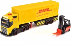 Ανακαλύψτε το ρεαλιστικό φορτηγό VOLVO με ρυμουλκούμενο από τη DICKIE TOYS με επίσημη άδεια DHL, μήκους 35 cm. Περιλαμβάνει κόκκινο κλαρκ και κιβώτια φορτίου για αυθεντικό παιχνίδι logistics. Το όχημα προσφέρει φωτεινά και ηχητικά εφέ, ανοίγόμενα και κινούμενα μέρη και ανθεκτική κατασκευή για παιχνίδι στο σπίτι, σε εξωτερικό χώρο και στην άμμο.