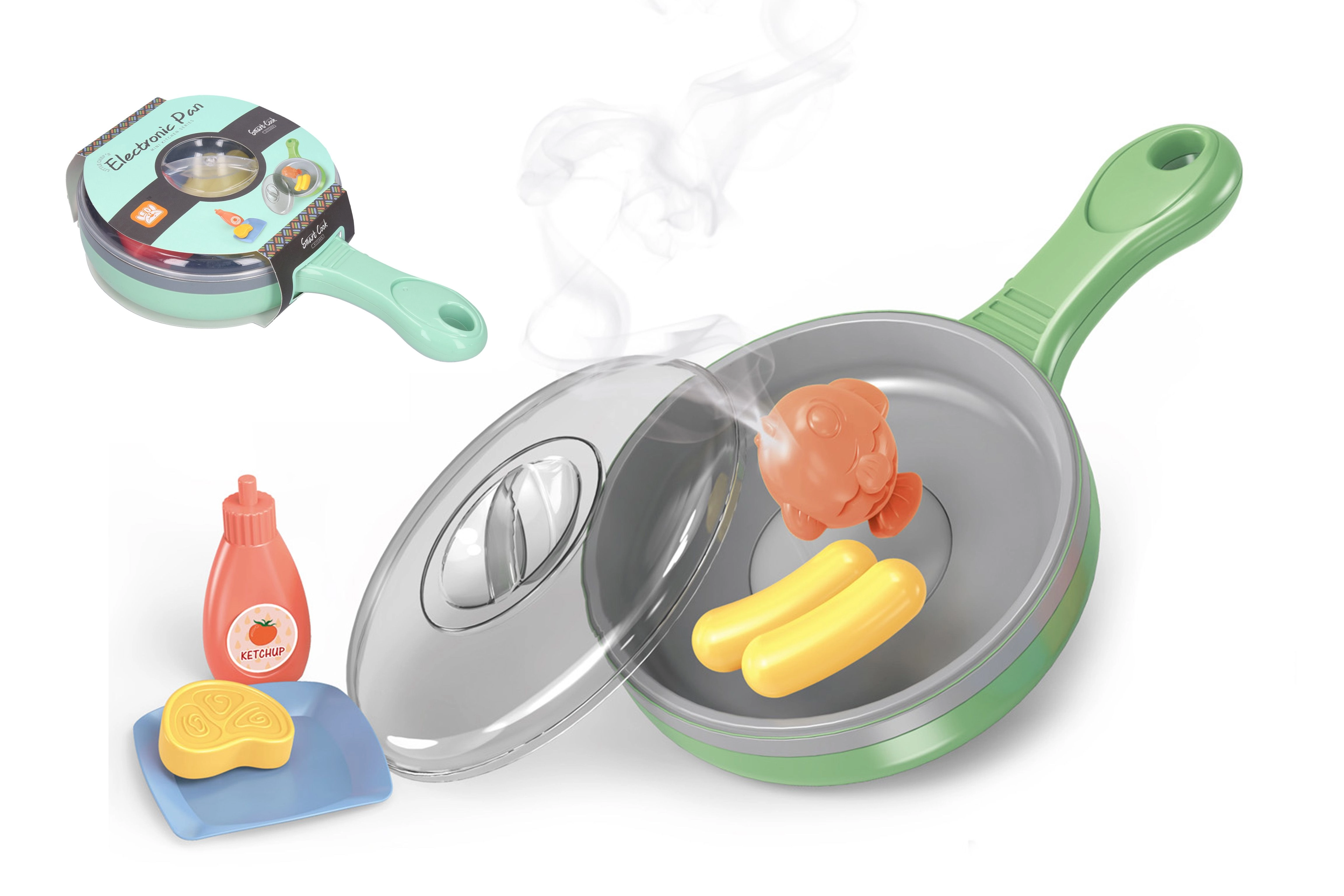 Διασκεδαστικό ηλεκτρονικό τηγάνι για μικρούς σεφ με διάμετρο 27 cm. Κατά το «τηγάνισμα» τα τρόφιμα αλλάζουν χρώμα, δημιουργώντας ρεαλιστικό εφέ μαγειρέματος. Περιλαμβάνει τηγάνι με καπάκι, πιατάκι, κέτσαπ και 4 τεμάχια τροφίμων. Λειτουργεί με 2× AAA μπαταρίες (δεν περιλαμβάνονται).