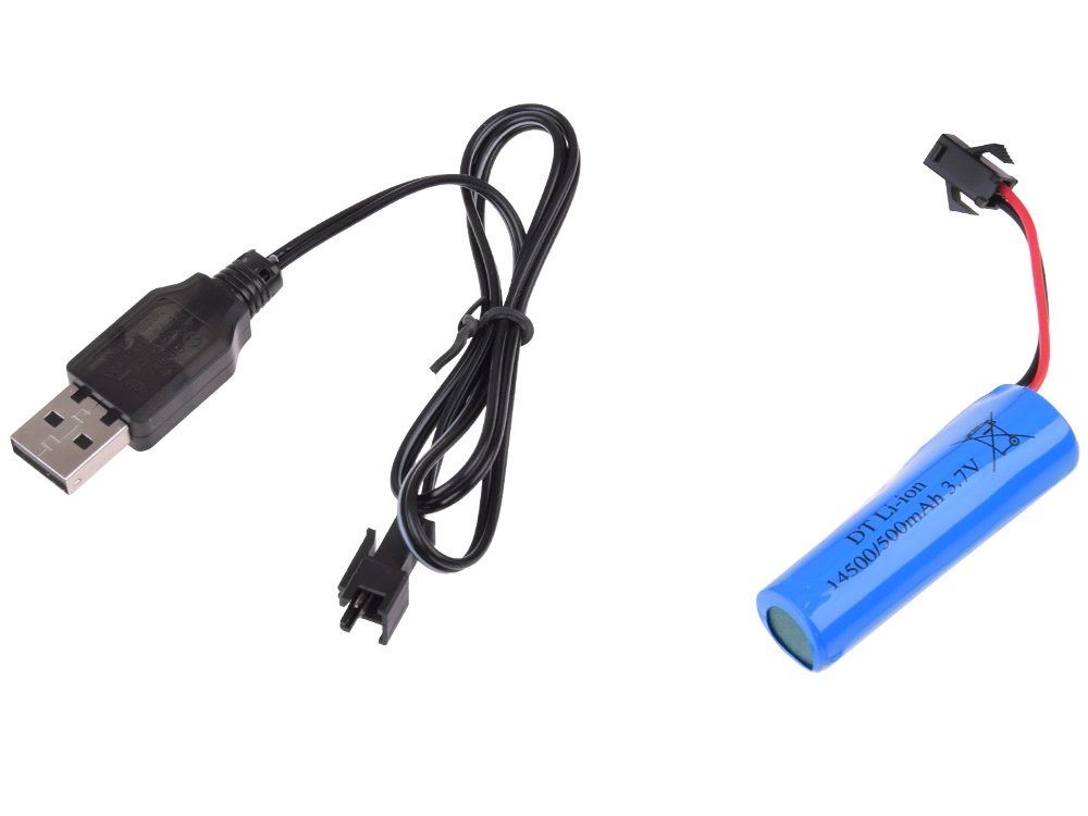 Ο τηλεχειρισμός είναι διαισθητικός και επιτρέπει κίνηση εμπρός/πίσω και στροφή αριστερά/δεξιά. Στη συσκευασία θα βρείτε όλα τα απαραίτητα: επαναφορτιζόμενο συσσωρευτή 3,7 V 500 mAh και καλώδιο USB για εύκολη φόρτιση. Το χειριστήριο τροφοδοτείται από 2× AA μπαταρίες (δεν περιλαμβάνονται). Για την καλύτερη απόδοση, φορτίστε για τουλάχιστον 2 ώρες πριν από την πρώτη χρήση.