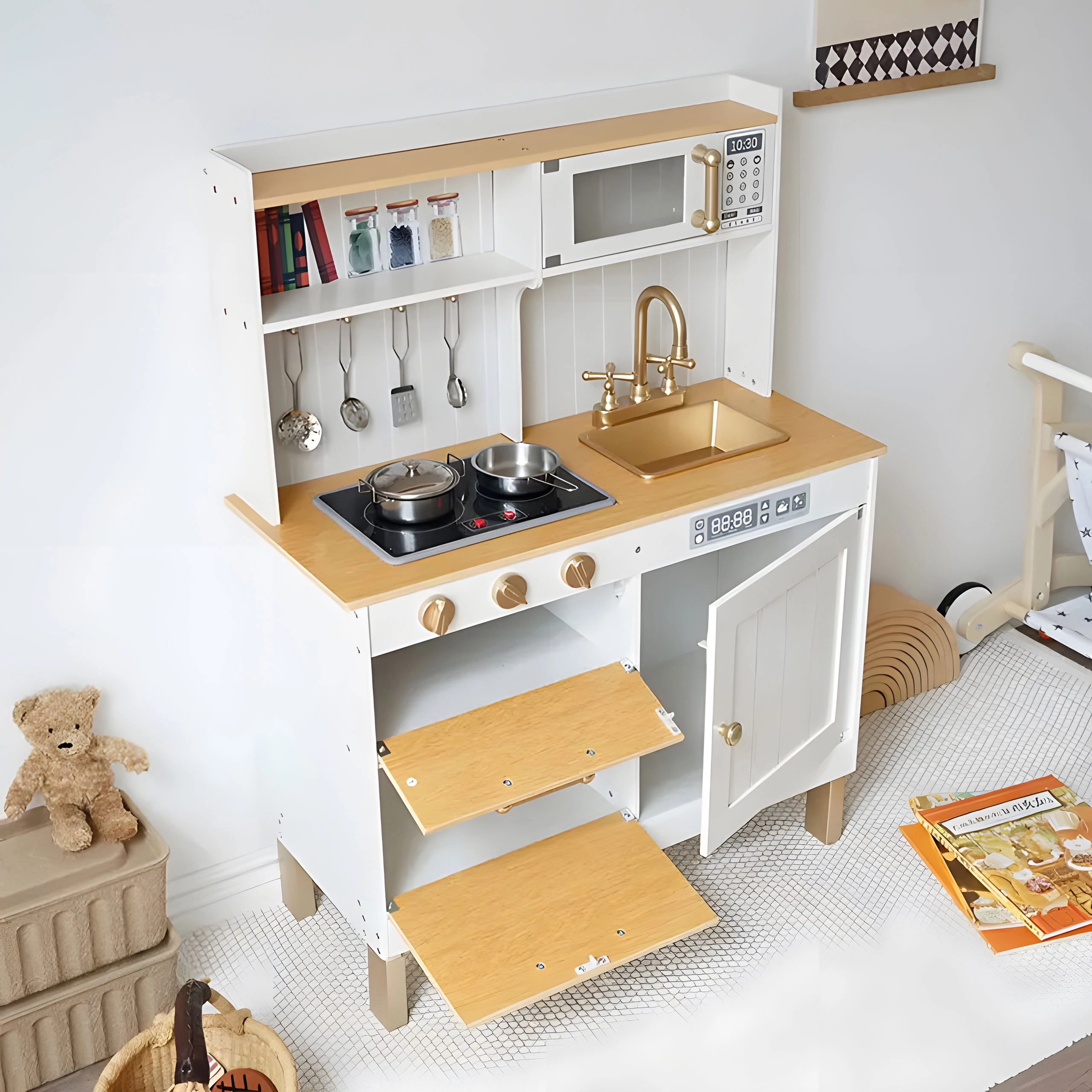 Η κουζίνα διαθέτει εστίες με LED φωτισμό και ηχητικά εφέ, που θυμίζουν τέλεια το πραγματικό μαγείρεμα. Τον χώρο παιχνιδιού επεκτείνουν οι ανοιγόμενες πόρτες των ντουλαπιών και τα περιστροφικά κουμπιά, που παράγουν αυθεντικό
