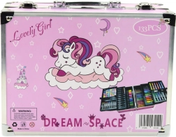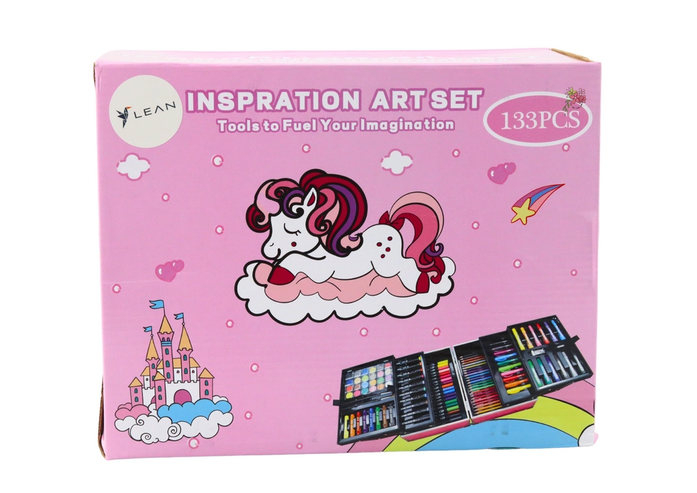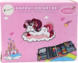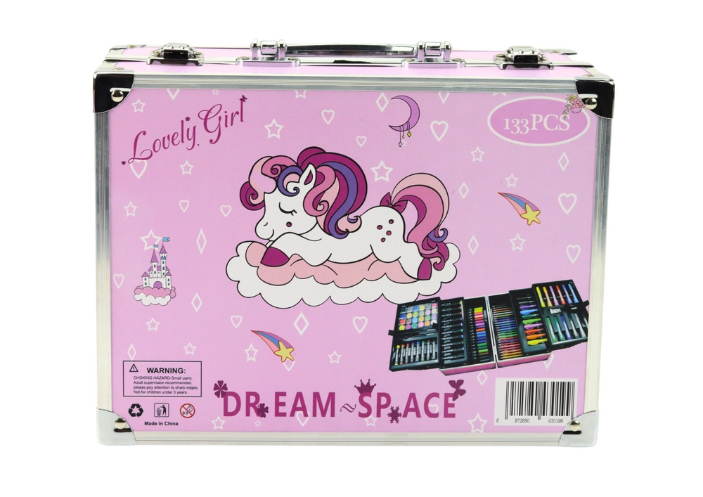 Πλήρες σετ ζωγραφικής με θέμα μονόκερο σε πρακτικό αναδιπλούμενο βαλιτσάκι, που περιλαμβάνει έως και 133 τεμάχια για ζωγραφική και σκίτσο. Θα βρείτε ακρυλικούς μαρκαδόρους/pen, διπλούς μαρκαδόρους, παστέλ, μολύβια και ξυλομπογιές, νερομπογιές, πινέλα, γόμες, ξύστρες και βιβλία ζωγραφικής. Ιδανικό για παιδιά από 3 ετών, ενισχύει την δημιουργικότητα και τη λεπτή κινητικότητα και μεταφέρεται εύκολα χάρη στις συμπαγείς διαστάσεις και το χερούλι.