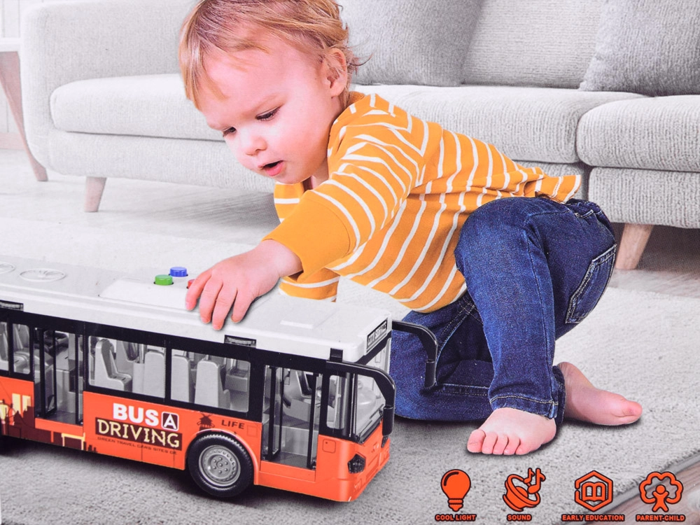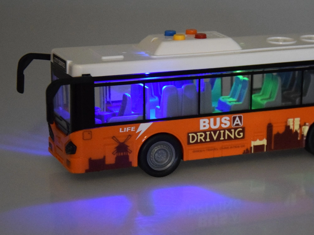 Στην οροφή του λεωφορείου υπάρχουν τέσσερα κουμπιά για ηχητικές και φωτεινές λειτουργίες: κίτρινο κουμπί - ήχος στάσης και ανοίγματος θυρών, μπλε κουμπί - ήχος εκκίνησης κινητήρα, κόκκινο κουμπί - κόρνα, πορτοκαλί κουμπί - ήχος όπισθεν. Οι ήχοι συνοδεύονται από πολύχρωμα αναβοσβήνοντα φώτα μέσα στην καμπίνα του λεωφορείου. Το παιχνίδι τροφοδοτείται από 3 μπαταρίες AG13 (περιλαμβάνονται στη συσκευασία).