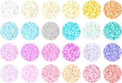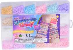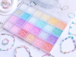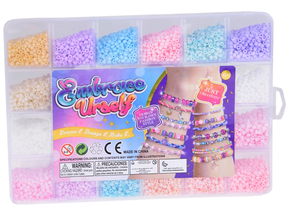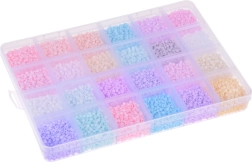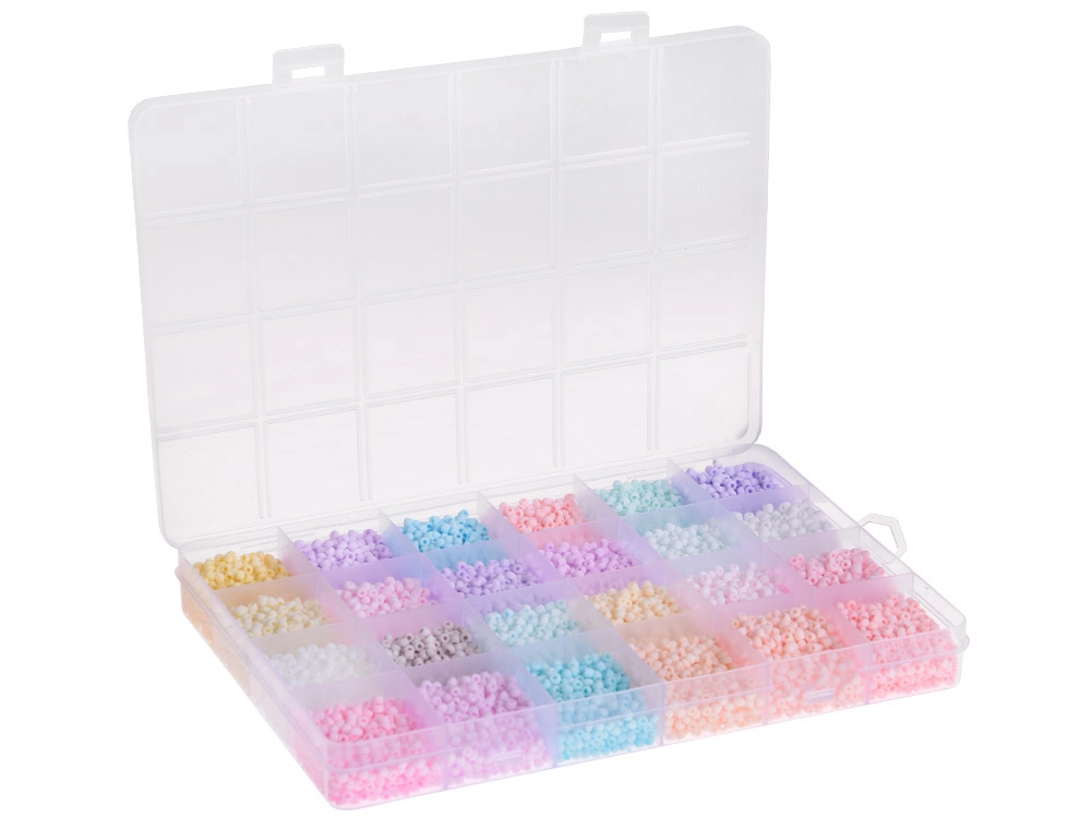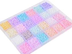 Περιλαμβάνει 24 διαφορετικά παστέλ χρώματα χαντρών: ροζ, μωβ, μπλε, μπεζ, πράσινο, λευκό και κίτρινο. Είναι αποθηκευμένες σε ένα διάφανο, επίμηκες κουτί, πρακτικά χωρισμένο σε θήκες. Έτσι αποφεύγεται το ανακάτεμα των χαντρών και διευκολύνεται η οργάνωσή τους.