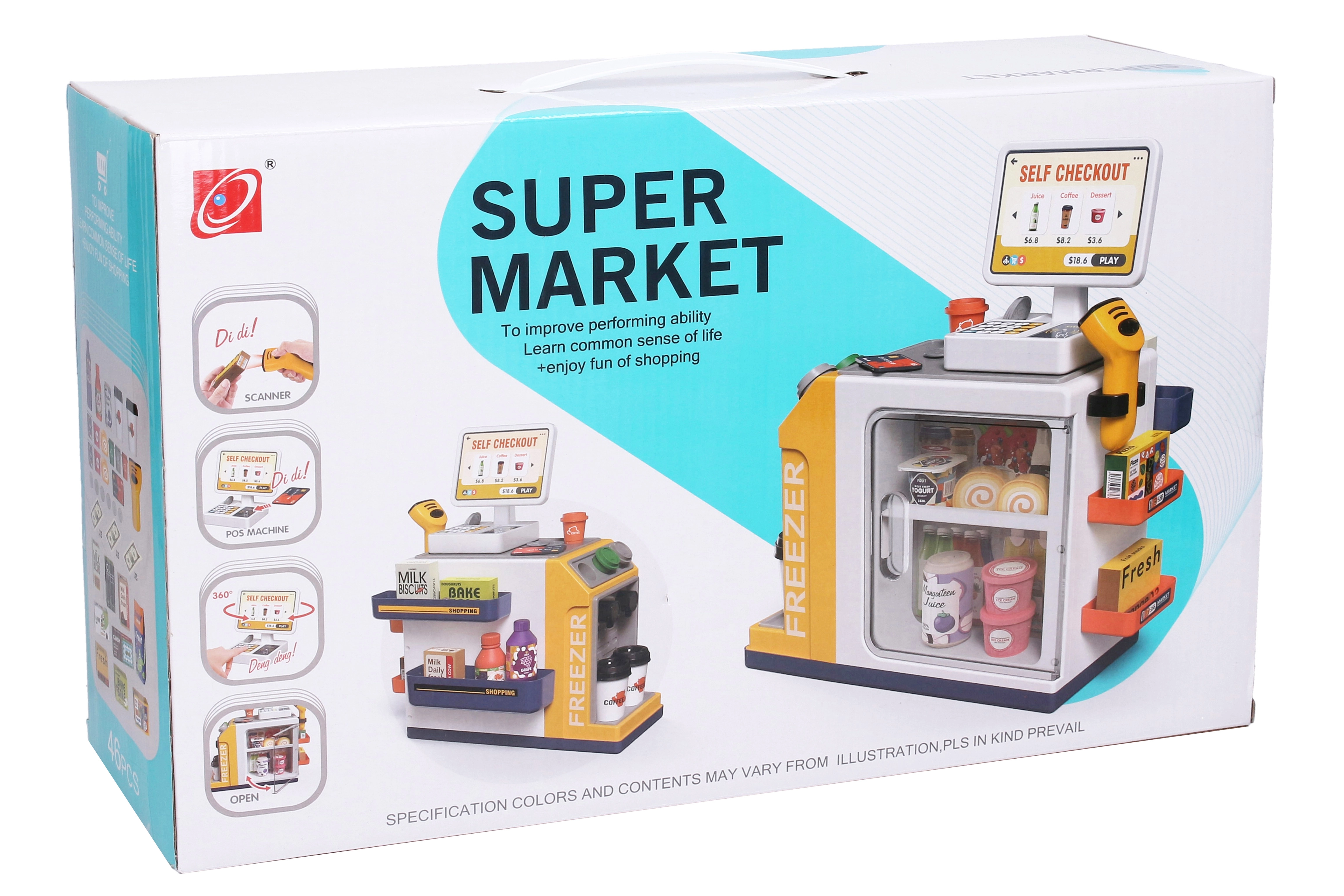 Αυτό το Σετ Σούπερ Μάρκετ είναι το ιδανικό παιχνίδι για όλους τους μικρούς λάτρεις των αγορών. Το σετ περιλαμβάνει ό,τι θα περιμένατε σε ένα πραγματικό σούπερ μάρκετ: πάγκο με ταμειακή μηχανή, χειροκίνητο σαρωτή, κάρτα πληρωμής, χάρτινα χαρτονομίσματα και κέρματα. Για παιχνίδια καταστήματος θα βρείτε στη συσκευασία επίσης ομοιώματα από καφέδες, χυμούς, γιαούρτια, γάλα, σούσι και γλυκίσματα.