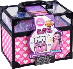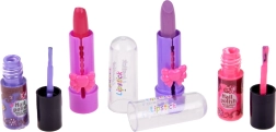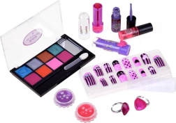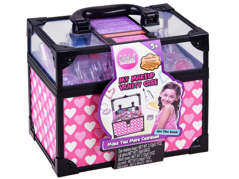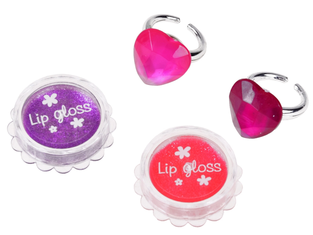 Το σετ περιλαμβάνει ό,τι χρειάζεται για μια πλήρη μεταμόρφωση: κρεμώδεις σκιές με απλικατέρ, λαμπερά γυαλιστικά και κραγιόν για τα χείλη, βερνίκια νυχιών, αυτοκόλλητες άκρες με έτοιμα σχέδια και χαριτωμένα δαχτυλιδάκια σε σχήμα καρδιάς. Το παιχνίδι με τα καλλυντικά αναπτύσσει τη λεπτή κινητικότητα, την αίσθηση των χρωμάτων και ενισχύει την αυτοέκφραση.