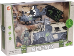 Δραστικό στρατιωτικό σετ για μικρούς στρατηγούς, που προσφέρει ώρες διασκέδασης στην ξηρά, στον αέρα και στο νερό. Περιλαμβάνει όχημα μήκους 25 εκ., φιγούρες στρατιωτών και πλούσιο εξοπλισμό. Για ακόμη μεγαλύτερη εμπειρία φροντίζουν τα φωτεινά και ηχητικά εφέ που ενεργοποιούνται με κουμπί στο όπλο του οχήματος. Χάρη στους ελεύθερους τροχούς η κίνηση είναι ομαλή και έτοιμη για κάθε αποστολή.