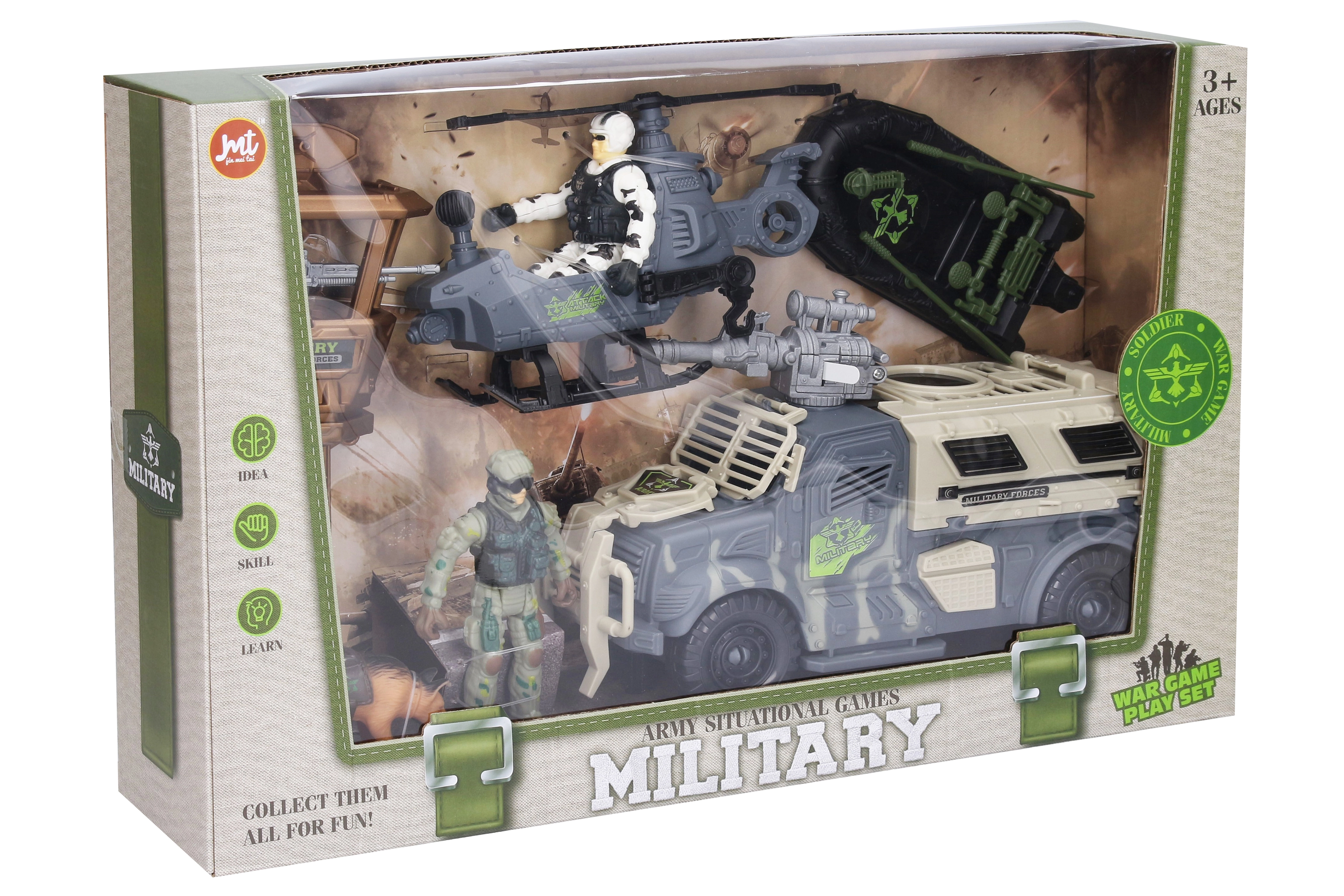 Δημιουργήστε το δικό σας σενάριο μάχης με ένα ολοκληρωμένο στρατιωτικό σετ που συνδυάζει χερσαίο όχημα, ελικόπτερο, λέμβο και άλλα αξεσουάρ. Δύο λεπτομερείς φιγούρες στρατιωτών, σκύλος και λειτουργικός πύργος επεκτείνουν τις δυνατότητες παιχνιδιού και ενισχύουν τη φαντασία και τη δημιουργική αφήγηση ιστοριών.
