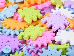 Τα τουβλάκια διατίθενται σε πολλά χρώματα όπως μπλε, πράσινο, ροζ, πορτοκαλί και λευκό, γεγονός που ενισχύει τη δημιουργικότητα και τις χωρικές δεξιότητες των παιδιών.