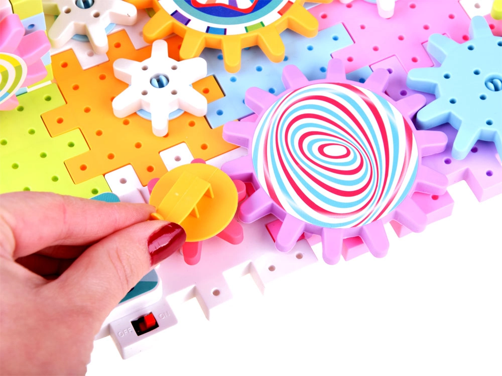 Το σετ κατασκευής περιλαμβάνει γρανάζια και μικρές φτερωτές με ζωάκια που μπορούν να περιστρέφονται, αναπτύσσοντας έτσι τον συντονισμό και την ικανότητα επίλυσης προβλημάτων.