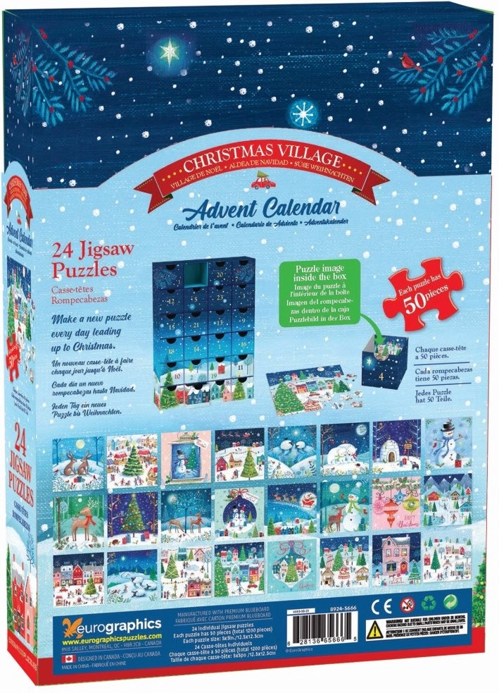 Το Adventní kalendář Eurographics προσφέρει μαγικές χριστουγεννιάτικες εμπειρίες με 24 διαφορετικές εικόνες παζλ, καθεμία με θέμα χριστουγεννιάτικα σκυλιά. Κάθε παζλ έχει 50 κομμάτια και διαστάσεις 12,5 x 12,5 cm, εξασφαλίζοντας την τέλεια πρόκληση για κάθε ημέρα της περιόδου advent.