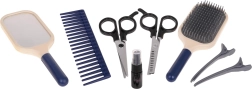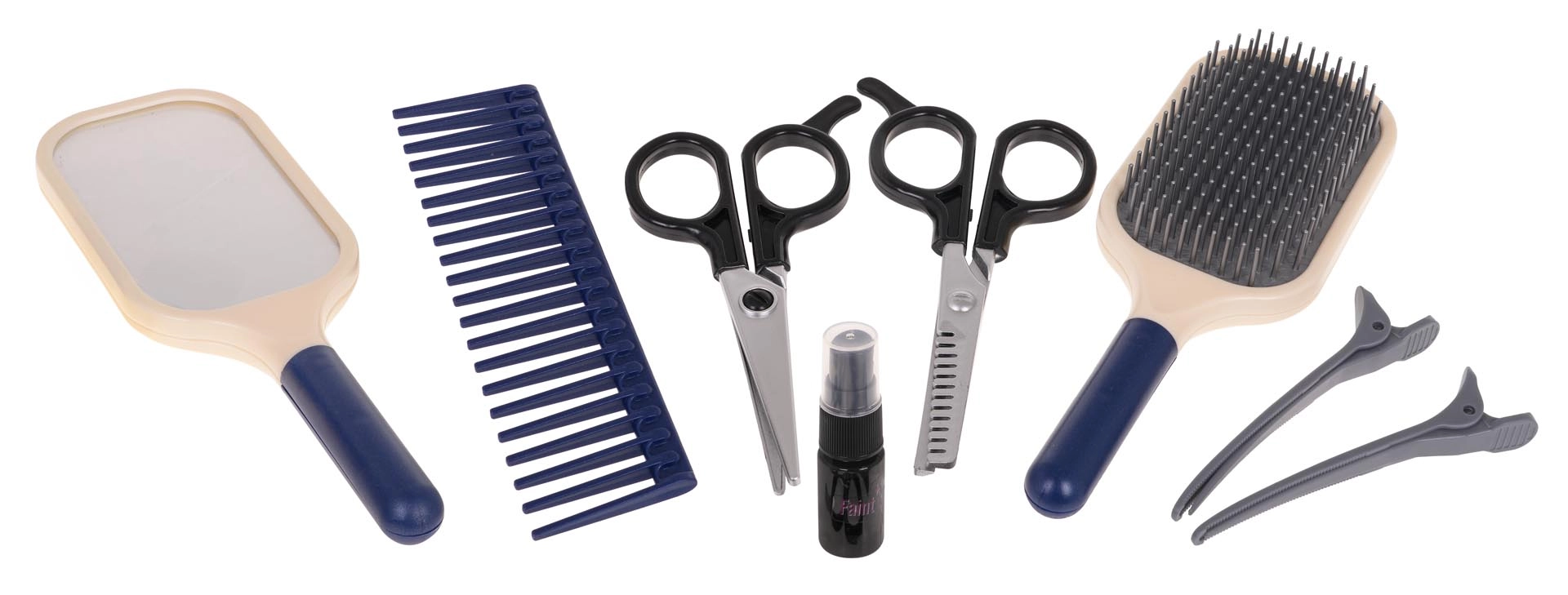 Ψαλίδι, αραιωτικό ψαλίδι, χτένα, βούρτσα, καθρεφτάκι, κοκαλάκια, βάση και δοχείο για καλλυντικά – όλα για δημιουργικά χτενίσματα σε ένα μέρος.